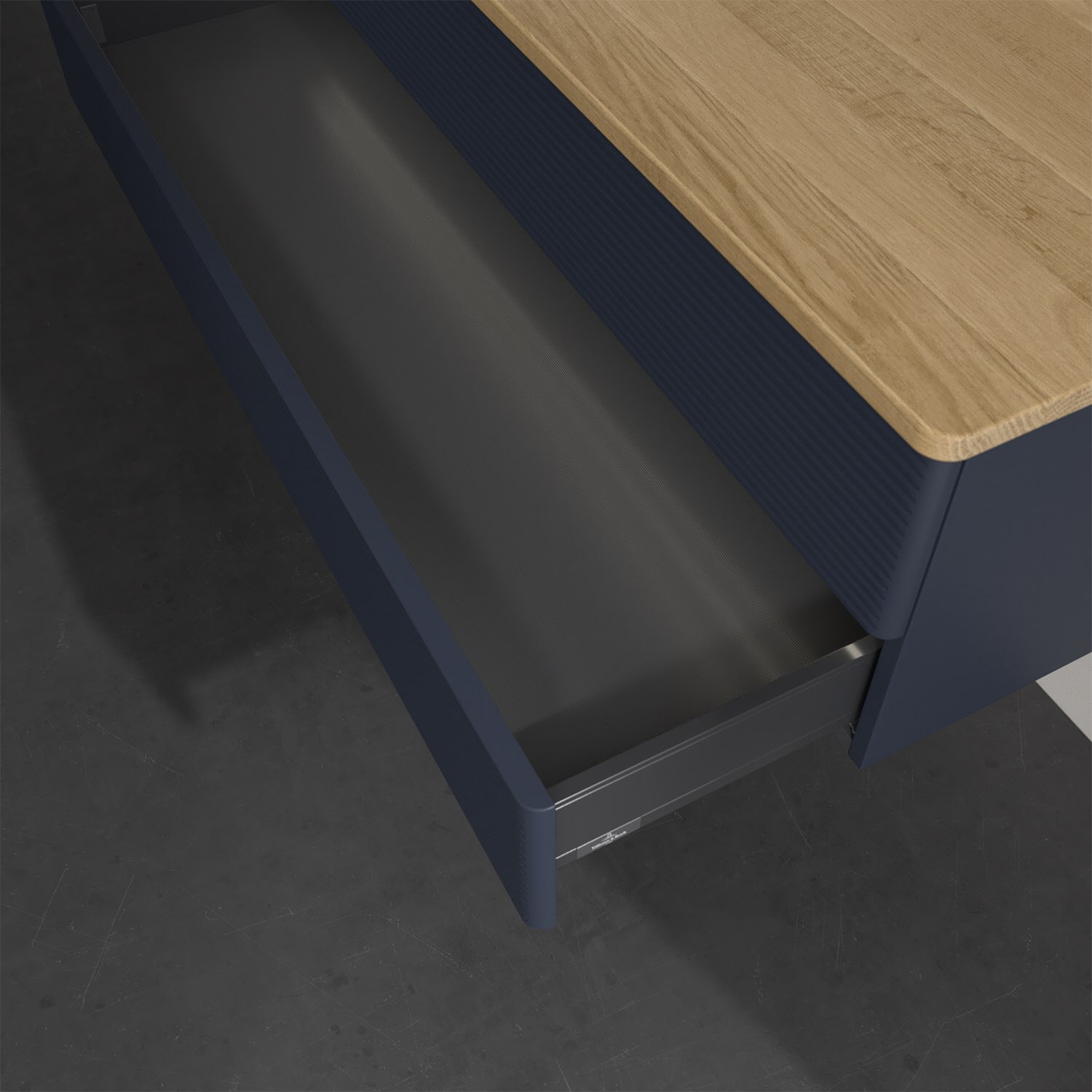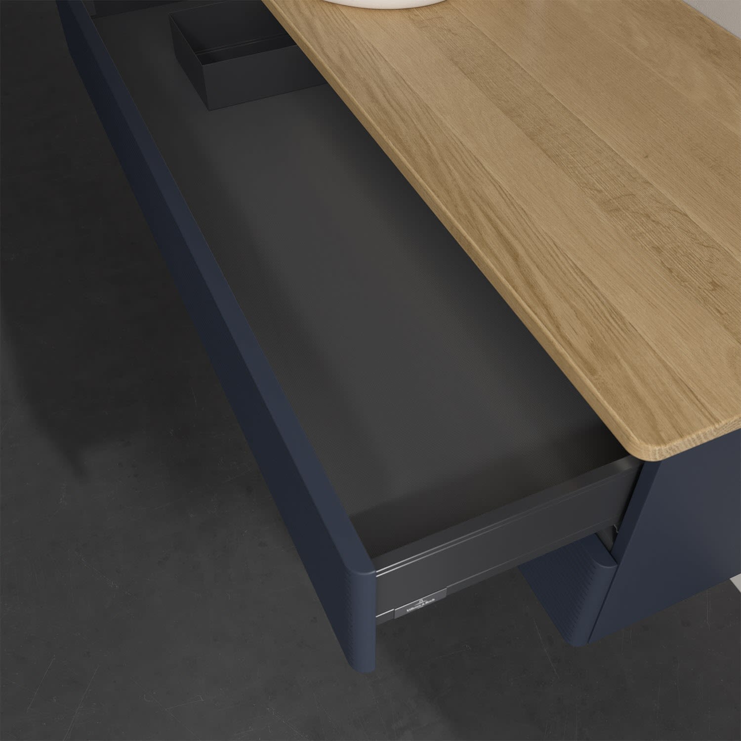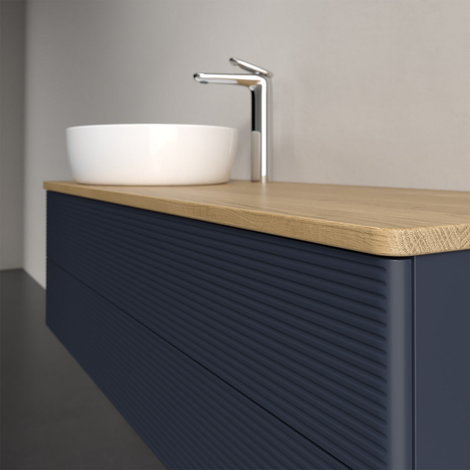 Der wandhängende Antao Waschtischunterschrank von Villeroy & Boch bietet nicht nur jede Menge Stauraum – er ist dank seines naturinspirierten Designs mit seinen abgerundeten Kanten auch noch besonders stilvoll und schafft eine gemütliche Atmosphäre im Badezimmer. Auf der Waschtischplatte bietet sich seitlich des Waschtischs viel Platz für Zahnbürstenbecher oder Seifenspender. Zwei geräumige Auszüge bieten viel Platz, um alles Notwendige zu verstauen und Ordnung zu halten. Öffnen lassen sie sich durch leichten Druck auf die strukturierte Front. Dabei aktiviert sich übrigens die Auszugsbeleuchtung in angenehmem Warmweiß. Dank Vollauszug hat man immer alles im Blick und der Antirutschboden verhindert ein Umfallen oder Verrutschen der Gegenstände. Einfach clever! Für eine besonders leichte Pflege sorgt die mehrschichtig deckend lackierte Oberfläche. Bei der Ausführung in Massivholz wird dank des verarbeiteten Massivholzes jedes Möbel zu einem Unikat, das sich durch das lebendige Naturmaterial durch seine einzigartige Struktur und Maserung auszeichnet.