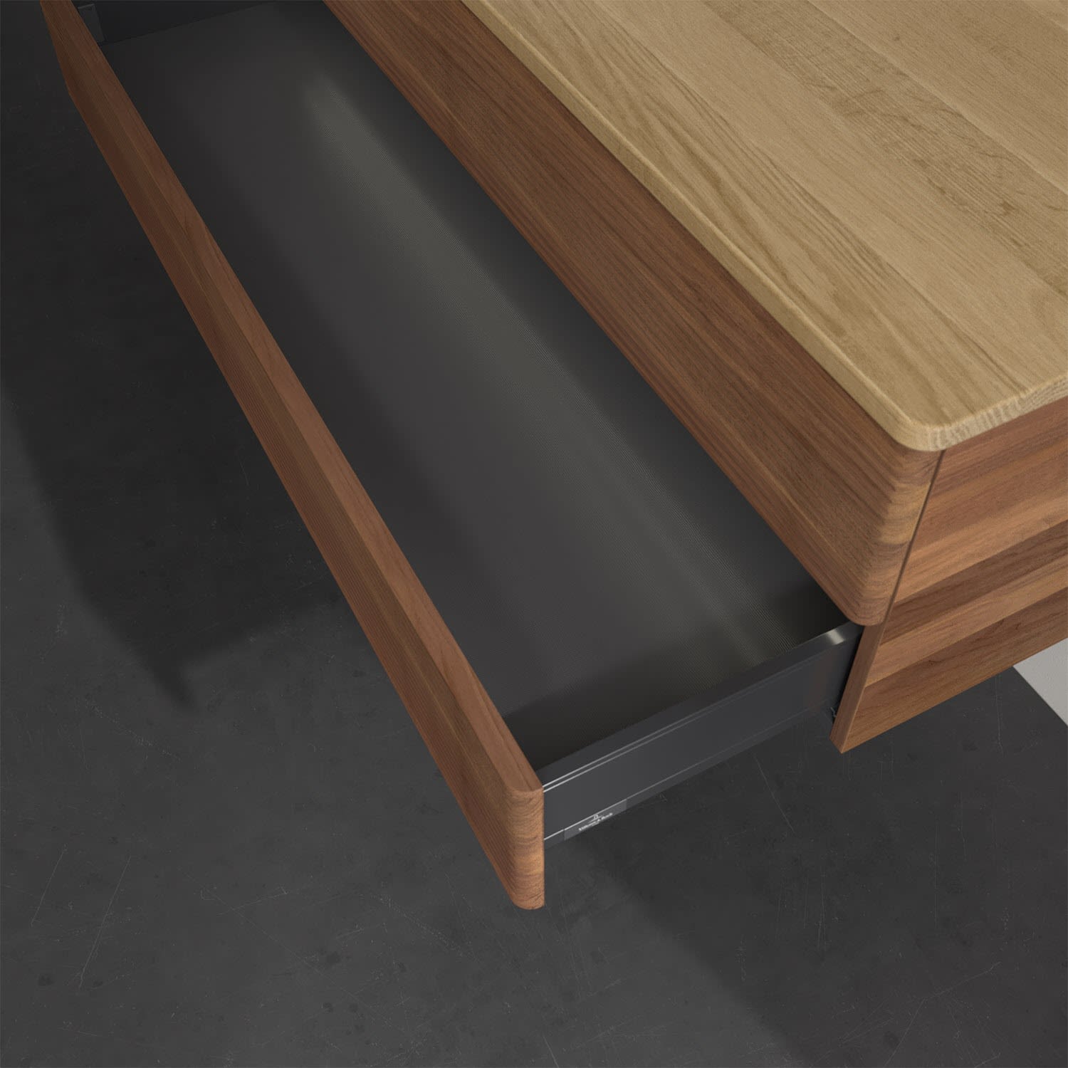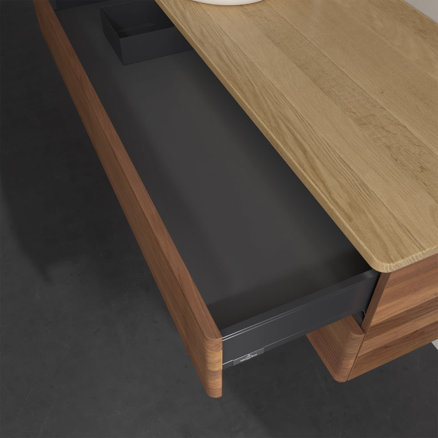 Der wandhängende Antao Waschtischunterschrank von Villeroy & Boch bietet nicht nur jede Menge Stauraum – er ist dank seines naturinspirierten Designs mit seinen abgerundeten Kanten auch noch besonders stilvoll und schafft eine gemütliche Atmosphäre im Badezimmer. Auf der Waschtischplatte bietet sich seitlich des Waschtischs viel Platz für Zahnbürstenbecher oder Seifenspender. Zwei geräumige Auszüge bieten viel Platz, um alles Notwendige zu verstauen und Ordnung zu halten. Öffnen lassen sie sich durch leichten Druck auf die strukturierte Front. Dabei aktiviert sich übrigens die Auszugsbeleuchtung in angenehmem Warmweiß. Dank Vollauszug hat man immer alles im Blick und der Antirutschboden verhindert ein Umfallen oder Verrutschen der Gegenstände. Einfach clever! Für eine besonders leichte Pflege sorgt die mehrschichtig deckend lackierte Oberfläche. Bei der Ausführung in Massivholz wird dank des verarbeiteten Massivholzes jedes Möbel zu einem Unikat, das sich durch das lebendige Naturmaterial durch seine einzigartige Struktur und Maserung auszeichnet.