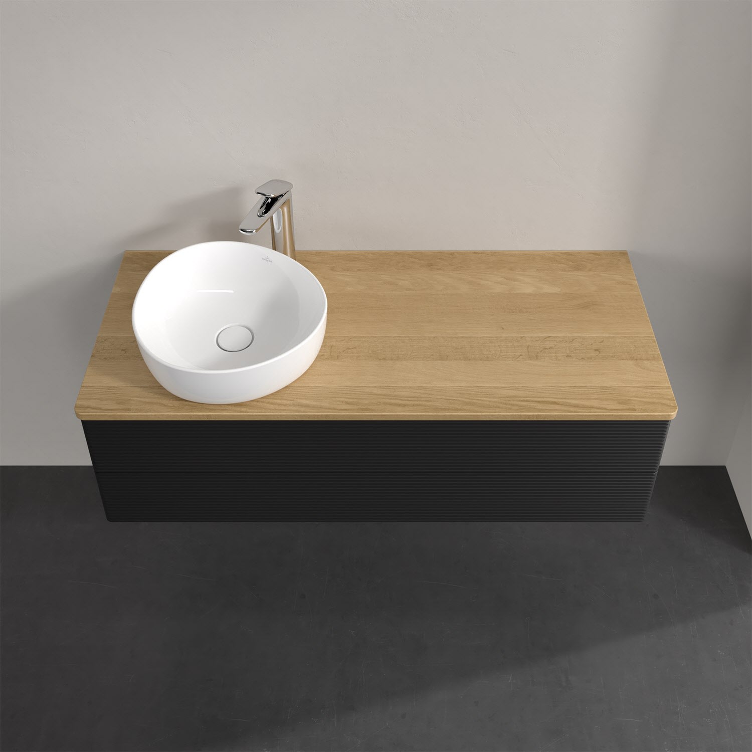 Villeroy & Boch Antao Waschbeckenunterschrank, 120 x 36 cm, 2 Auszüge mit LED-Licht, Front mit Struktur, mit Hahnloch, für Waschtisch links