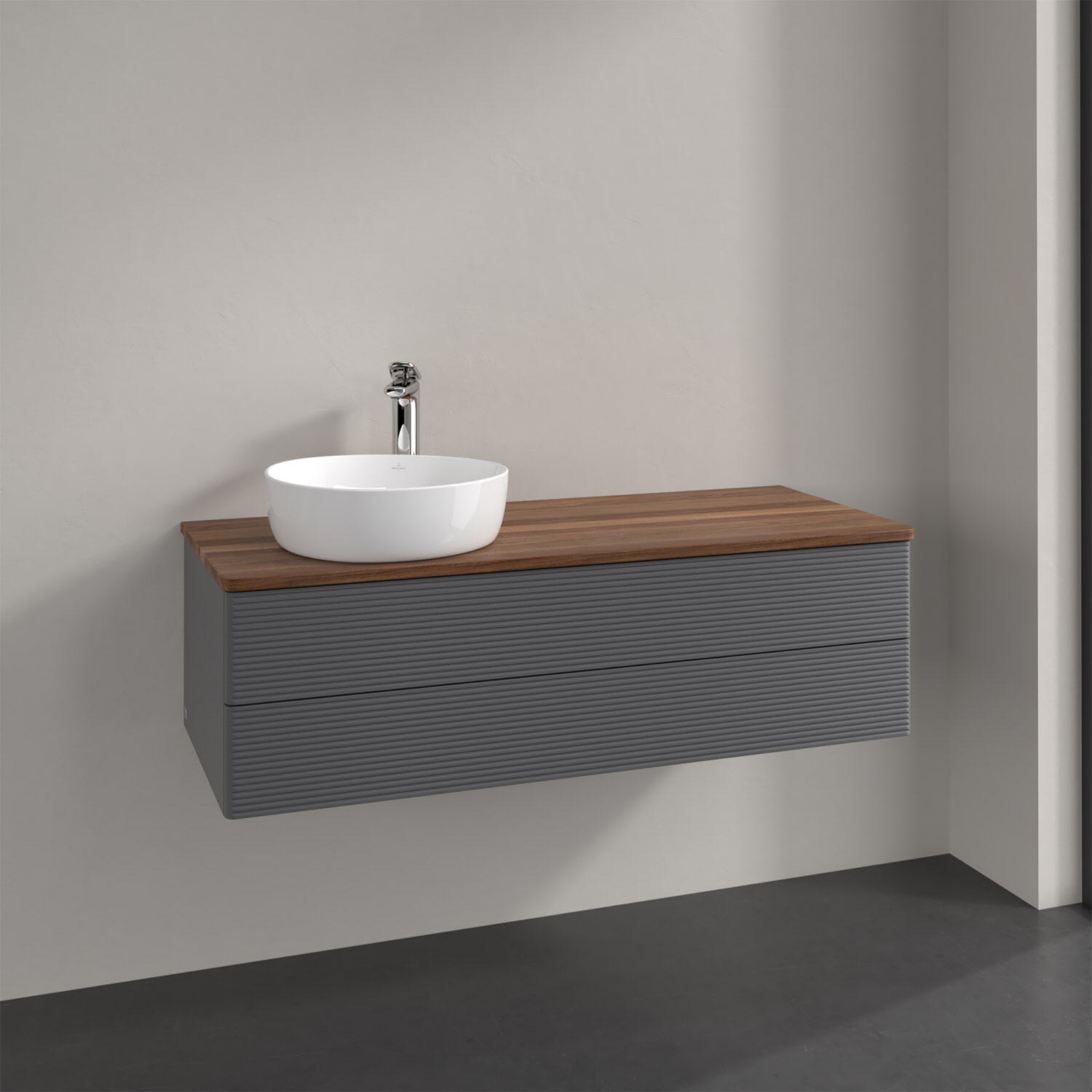 Villeroy & Boch Antao Waschbeckenunterschrank, 120 x 36 cm, 2 Auszüge mit LED-Licht, Front mit Struktur, mit Hahnloch, für Waschtisch links
