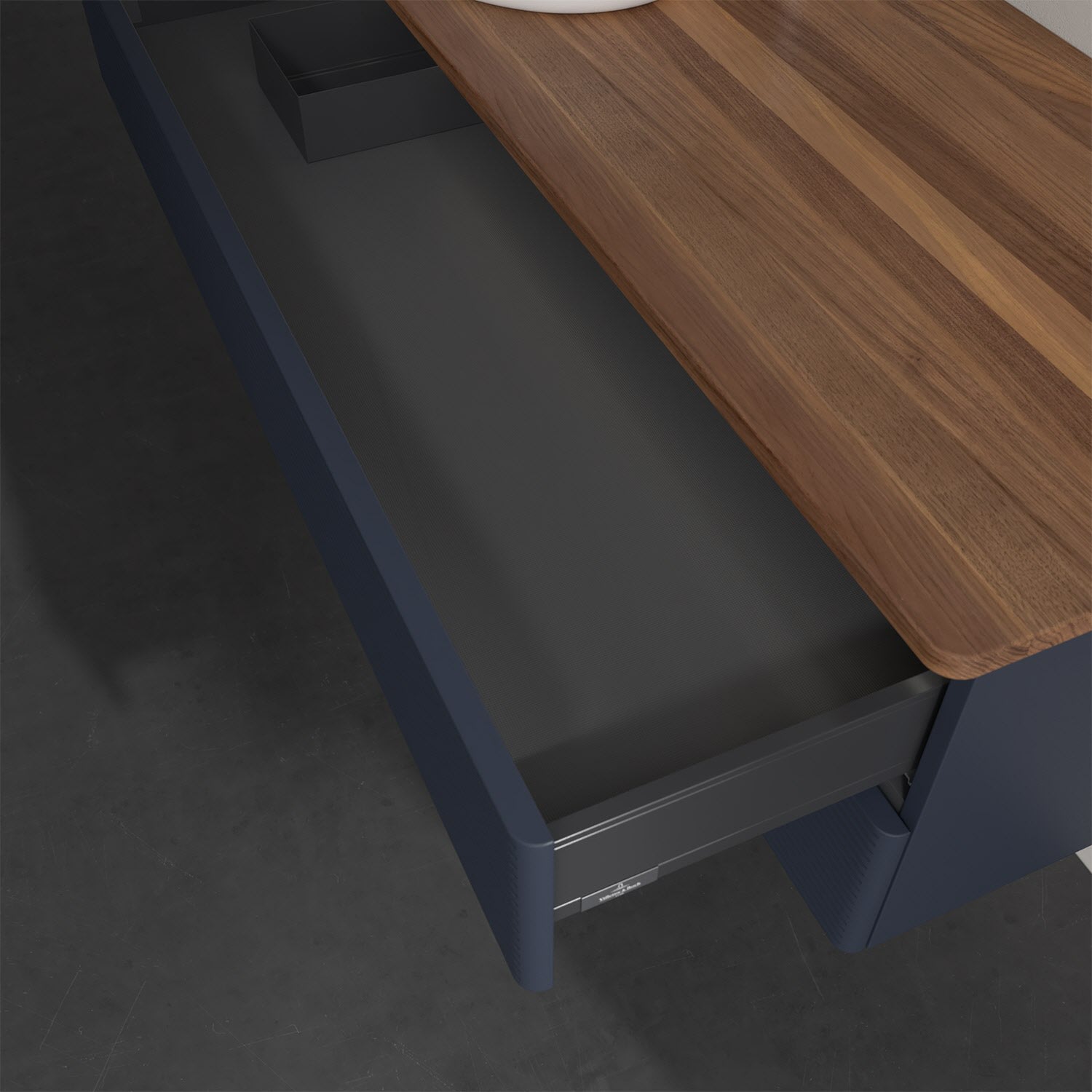 Der wandhängende Antao Waschtischunterschrank von Villeroy & Boch bietet nicht nur jede Menge Stauraum – er ist dank seines naturinspirierten Designs mit seinen abgerundeten Kanten auch noch besonders stilvoll und schafft eine gemütliche Atmosphäre im Badezimmer. Auf der Waschtischplatte bietet sich seitlich des Waschtischs viel Platz für Zahnbürstenbecher oder Seifenspender. Zwei geräumige Auszüge bieten viel Platz, um alles Notwendige zu verstauen und Ordnung zu halten. Öffnen lassen sie sich durch leichten Druck auf die strukturierte Front. Dabei aktiviert sich übrigens die Auszugsbeleuchtung in angenehmem Warmweiß. Dank Vollauszug hat man immer alles im Blick und der Antirutschboden verhindert ein Umfallen oder Verrutschen der Gegenstände. Einfach clever! Für eine besonders leichte Pflege sorgt die mehrschichtig deckend lackierte Oberfläche. Bei der Ausführung in Massivholz wird dank des verarbeiteten Massivholzes jedes Möbel zu einem Unikat, das sich durch das lebendige Naturmaterial durch seine einzigartige Struktur und Maserung auszeichnet.