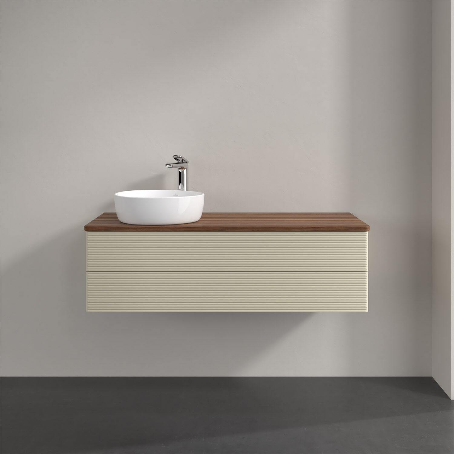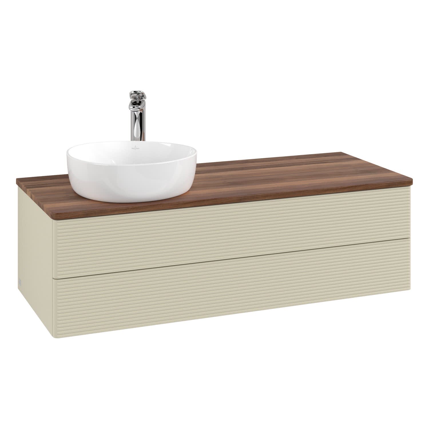 Villeroy & Boch Antao Waschbeckenunterschrank, 120 x 36 cm, 2 Auszüge mit LED-Licht, Front mit Struktur, mit Hahnloch, für Waschtisch links