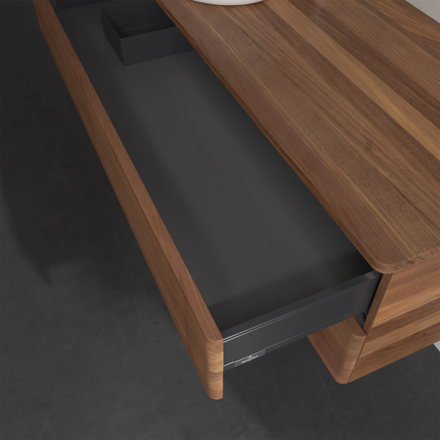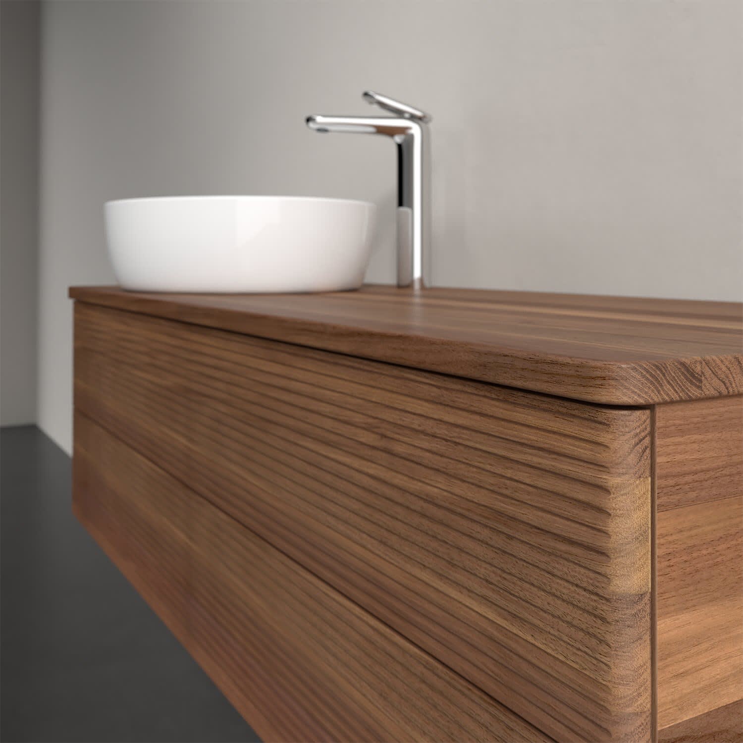 Der wandhängende Antao Waschtischunterschrank von Villeroy & Boch bietet nicht nur jede Menge Stauraum – er ist dank seines naturinspirierten Designs mit seinen abgerundeten Kanten auch noch besonders stilvoll und schafft eine gemütliche Atmosphäre im Badezimmer. Auf der Waschtischplatte bietet sich seitlich des Waschtischs viel Platz für Zahnbürstenbecher oder Seifenspender. Zwei geräumige Auszüge bieten viel Platz, um alles Notwendige zu verstauen und Ordnung zu halten. Öffnen lassen sie sich durch leichten Druck auf die strukturierte Front. Dabei aktiviert sich übrigens die Auszugsbeleuchtung in angenehmem Warmweiß. Dank Vollauszug hat man immer alles im Blick und der Antirutschboden verhindert ein Umfallen oder Verrutschen der Gegenstände. Einfach clever! Für eine besonders leichte Pflege sorgt die mehrschichtig deckend lackierte Oberfläche. Bei der Ausführung in Massivholz wird dank des verarbeiteten Massivholzes jedes Möbel zu einem Unikat, das sich durch das lebendige Naturmaterial durch seine einzigartige Struktur und Maserung auszeichnet.