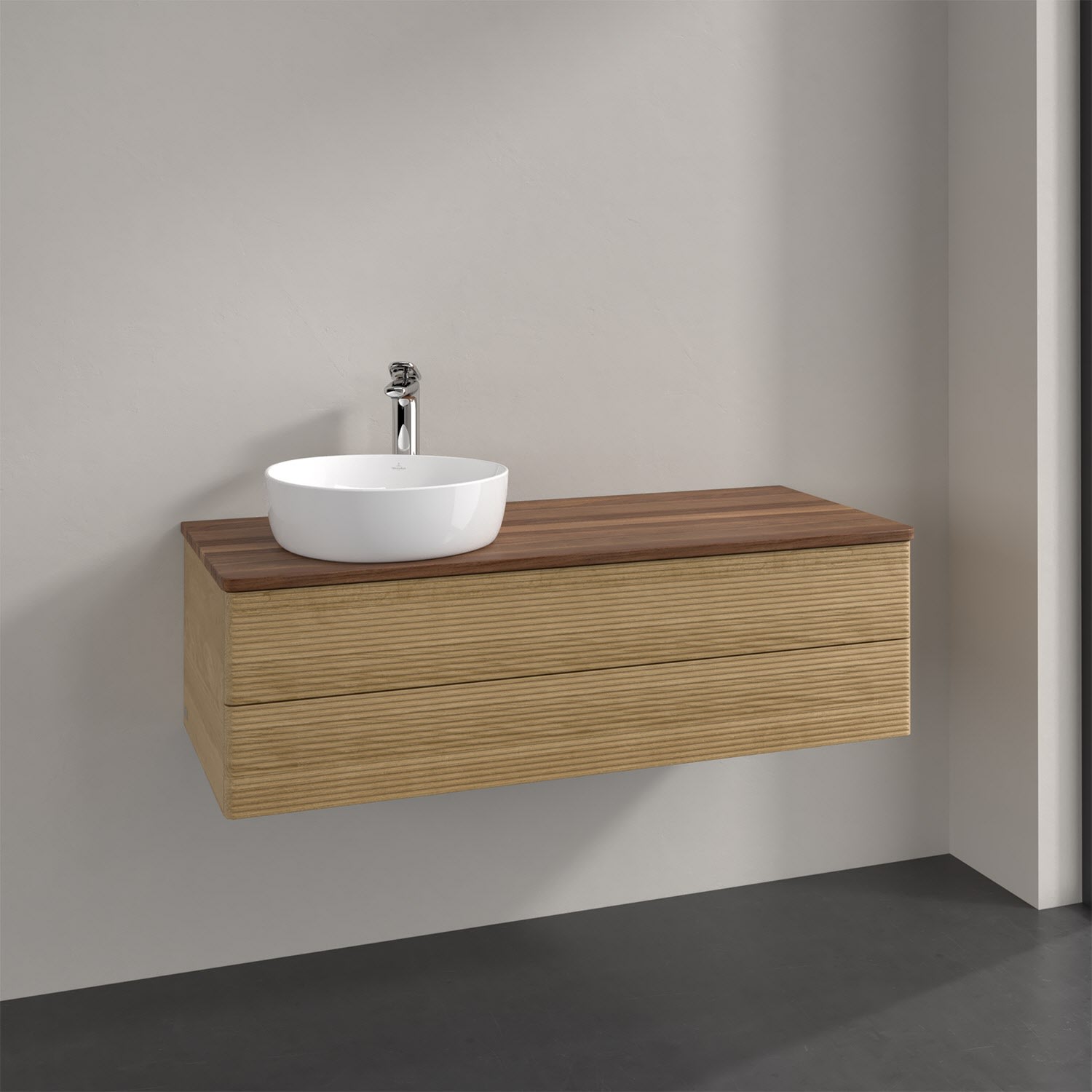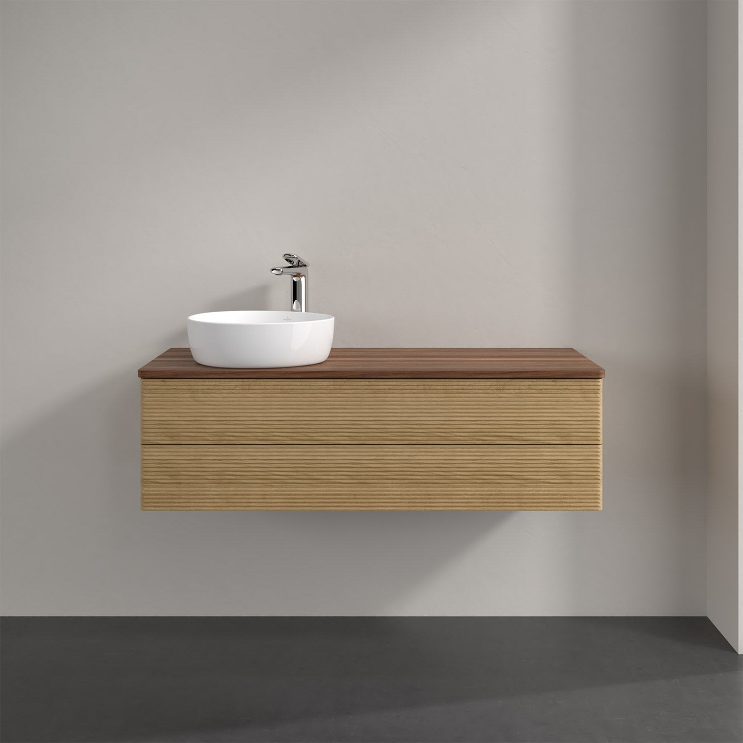 Villeroy & Boch Antao Waschbeckenunterschrank, 120 x 36 cm, 2 Auszüge mit LED-Licht, Front mit Struktur, mit Hahnloch, für Waschtisch links
