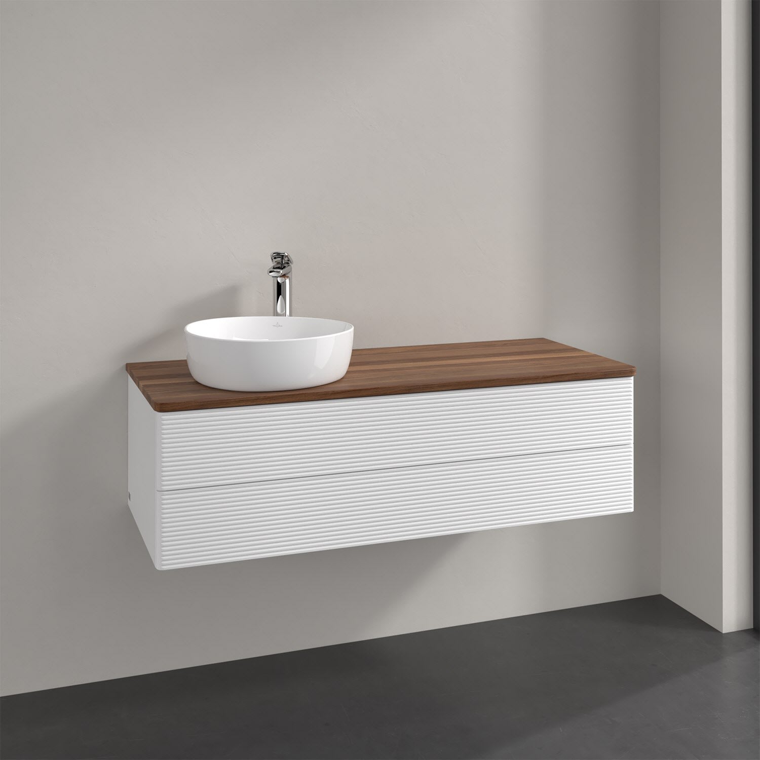Villeroy & Boch Antao Waschbeckenunterschrank, 120 x 36 cm, 2 Auszüge mit LED-Licht, Front mit Struktur, mit Hahnloch, für Waschtisch links
