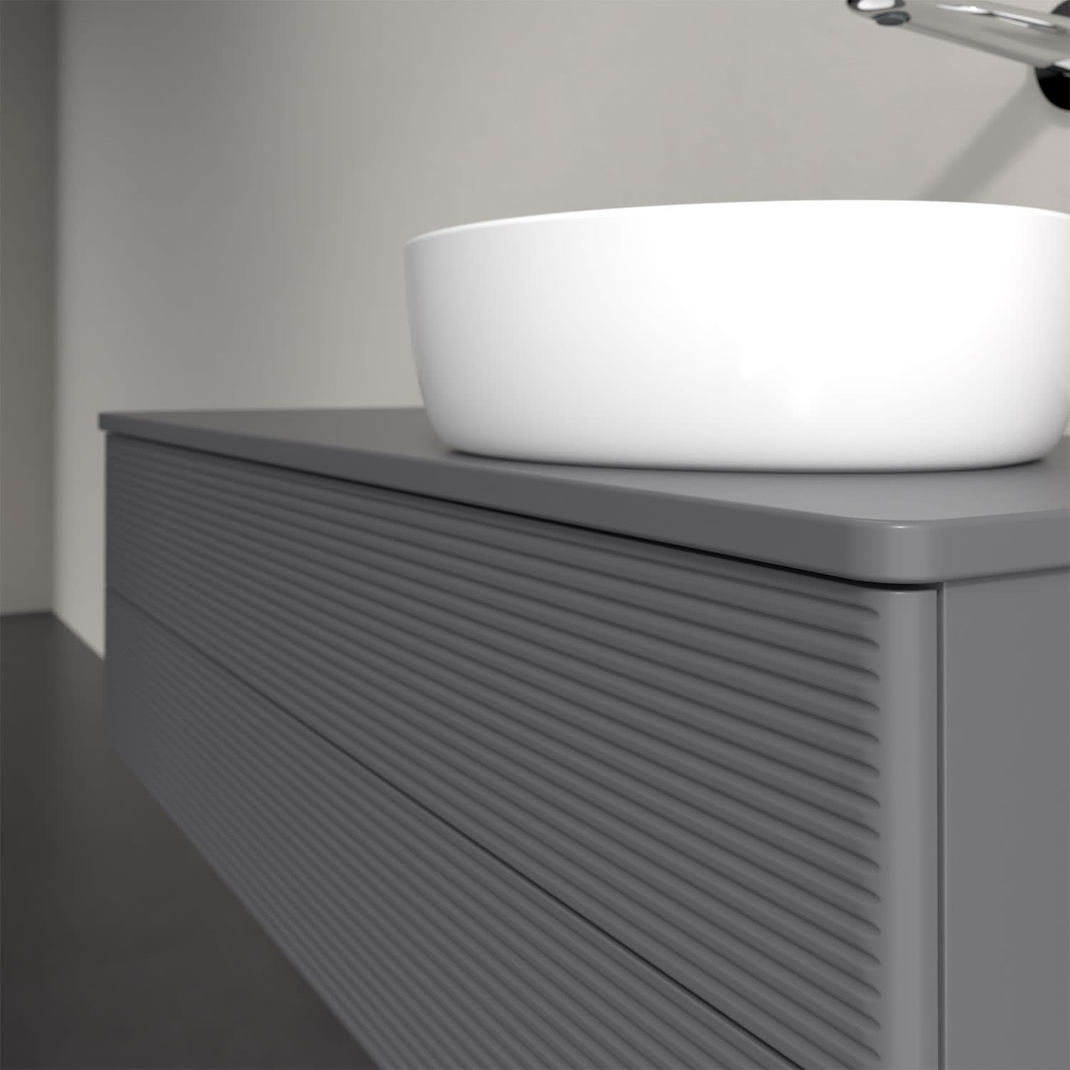 Der wandhängende Antao Waschtischunterschrank von Villeroy & Boch bietet nicht nur jede Menge Stauraum – er ist dank seines naturinspirierten Designs mit seinen abgerundeten Kanten auch noch besonders stilvoll und schafft eine gemütliche Atmosphäre im Badezimmer. Auf der Waschtischplatte bietet sich seitlich des Waschtischs viel Platz für Zahnbürstenbecher oder Seifenspender. Zwei geräumige Auszüge bieten viel Platz, um alles Notwendige zu verstauen und Ordnung zu halten. Öffnen lassen sie sich durch leichten Druck auf die strukturierte Front. Dabei aktiviert sich übrigens die Auszugsbeleuchtung in angenehmem Warmweiß. Dank Vollauszug hat man immer alles im Blick und der Antirutschboden verhindert ein Umfallen oder Verrutschen der Gegenstände. Einfach clever! Für eine besonders leichte Pflege sorgt die mehrschichtig deckend lackierte Oberfläche.
