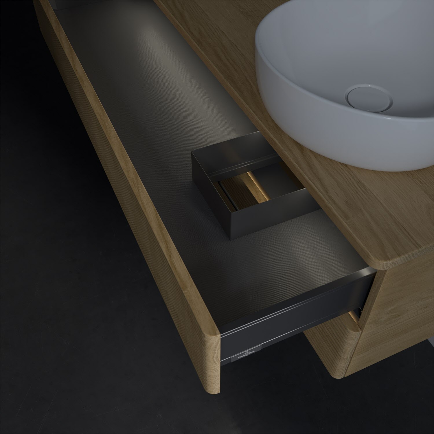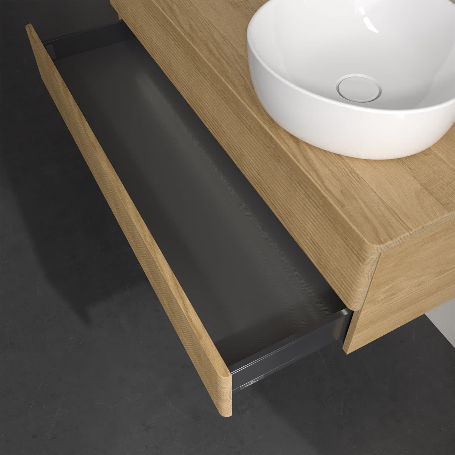 Der wandhängende Antao Waschtischunterschrank von Villeroy & Boch bietet nicht nur jede Menge Stauraum – er ist dank seines naturinspirierten Designs mit seinen abgerundeten Kanten auch noch besonders stilvoll und schafft eine gemütliche Atmosphäre im Badezimmer. Auf der Waschtischplatte bietet sich seitlich des Waschtischs viel Platz für Zahnbürstenbecher oder Seifenspender. Zwei geräumige Auszüge bieten viel Platz, um alles Notwendige zu verstauen und Ordnung zu halten. Öffnen lassen sie sich durch leichten Druck auf die strukturierte Front. Dabei aktiviert sich übrigens die Auszugsbeleuchtung in angenehmem Warmweiß. Dank Vollauszug hat man immer alles im Blick und der Antirutschboden verhindert ein Umfallen oder Verrutschen der Gegenstände. Einfach clever! Für eine besonders leichte Pflege sorgt die mehrschichtig deckend lackierte Oberfläche. Bei der Ausführung in Massivholz wird dank des verarbeiteten Massivholzes jedes Möbel zu einem Unikat, das sich durch das lebendige Naturmaterial durch seine einzigartige Struktur und Maserung auszeichnet.
