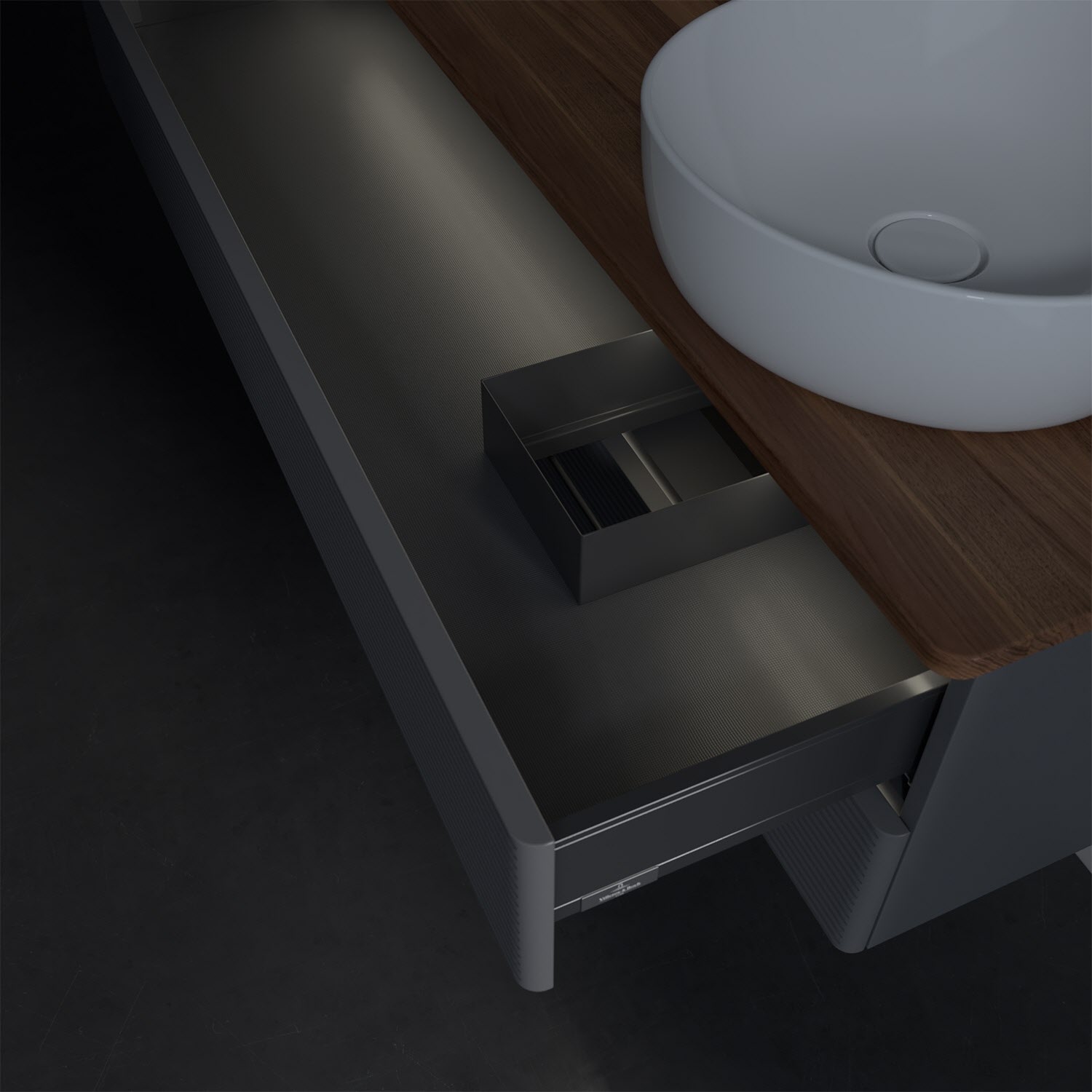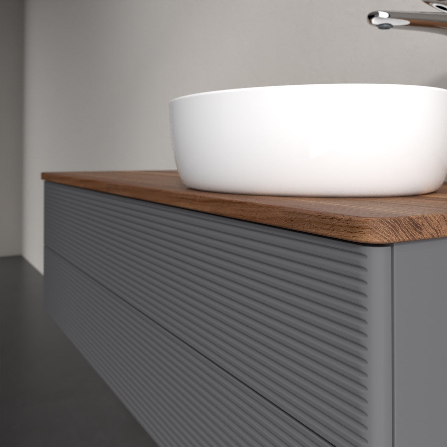 Der wandhängende Antao Waschtischunterschrank von Villeroy & Boch bietet nicht nur jede Menge Stauraum – er ist dank seines naturinspirierten Designs mit seinen abgerundeten Kanten auch noch besonders stilvoll und schafft eine gemütliche Atmosphäre im Badezimmer. Auf der Waschtischplatte bietet sich seitlich des Waschtischs viel Platz für Zahnbürstenbecher oder Seifenspender. Zwei geräumige Auszüge bieten viel Platz, um alles Notwendige zu verstauen und Ordnung zu halten. Öffnen lassen sie sich durch leichten Druck auf die strukturierte Front. Dabei aktiviert sich übrigens die Auszugsbeleuchtung in angenehmem Warmweiß. Dank Vollauszug hat man immer alles im Blick und der Antirutschboden verhindert ein Umfallen oder Verrutschen der Gegenstände. Einfach clever! Für eine besonders leichte Pflege sorgt die mehrschichtig deckend lackierte Oberfläche. Bei der Ausführung in Massivholz wird dank des verarbeiteten Massivholzes jedes Möbel zu einem Unikat, das sich durch das lebendige Naturmaterial durch seine einzigartige Struktur und Maserung auszeichnet.