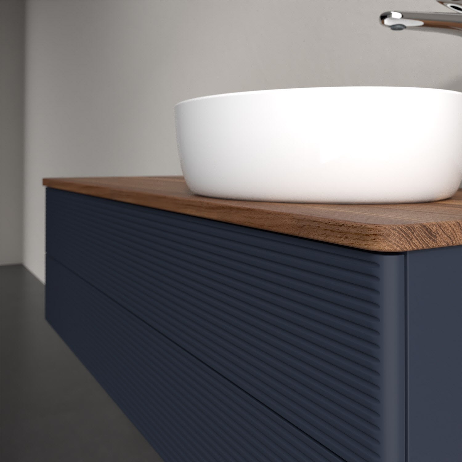 Der wandhängende Antao Waschtischunterschrank von Villeroy & Boch bietet nicht nur jede Menge Stauraum – er ist dank seines naturinspirierten Designs mit seinen abgerundeten Kanten auch noch besonders stilvoll und schafft eine gemütliche Atmosphäre im Badezimmer. Auf der Waschtischplatte bietet sich seitlich des Waschtischs viel Platz für Zahnbürstenbecher oder Seifenspender. Zwei geräumige Auszüge bieten viel Platz, um alles Notwendige zu verstauen und Ordnung zu halten. Öffnen lassen sie sich durch leichten Druck auf die strukturierte Front. Dabei aktiviert sich übrigens die Auszugsbeleuchtung in angenehmem Warmweiß. Dank Vollauszug hat man immer alles im Blick und der Antirutschboden verhindert ein Umfallen oder Verrutschen der Gegenstände. Einfach clever! Für eine besonders leichte Pflege sorgt die mehrschichtig deckend lackierte Oberfläche. Bei der Ausführung in Massivholz wird dank des verarbeiteten Massivholzes jedes Möbel zu einem Unikat, das sich durch das lebendige Naturmaterial durch seine einzigartige Struktur und Maserung auszeichnet.