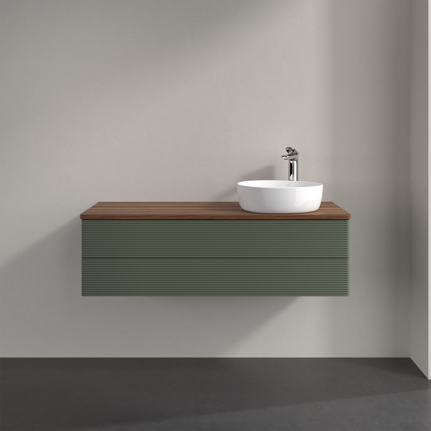 Villeroy & Boch Antao Waschbeckenunterschrank, 120 x 36 cm, 2 Auszüge mit LED-Licht, Front mit Struktur, mit Hahnloch, für Waschtisch rechts