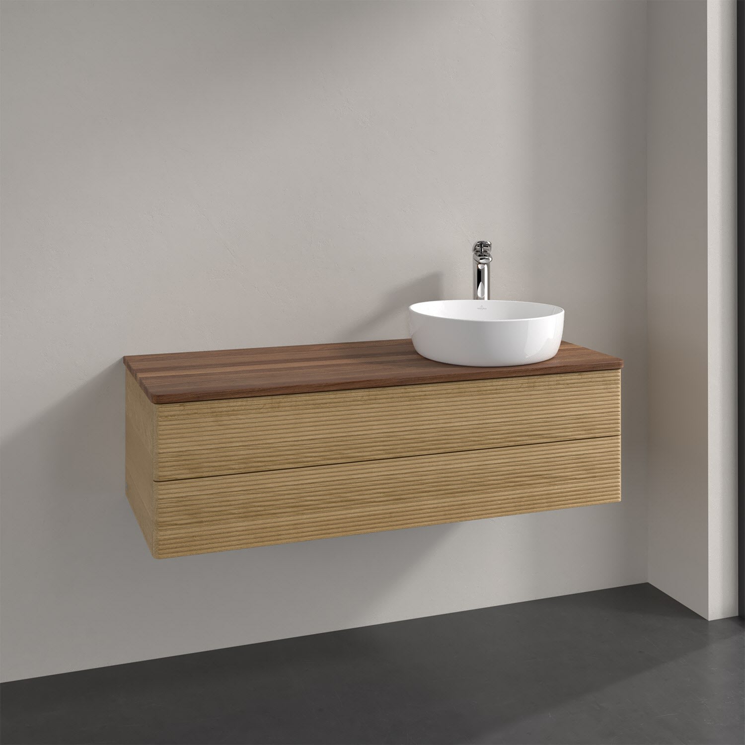 Villeroy & Boch Antao Waschbeckenunterschrank, 120 x 36 cm, 2 Auszüge mit LED-Licht, Front mit Struktur, mit Hahnloch, für Waschtisch rechts