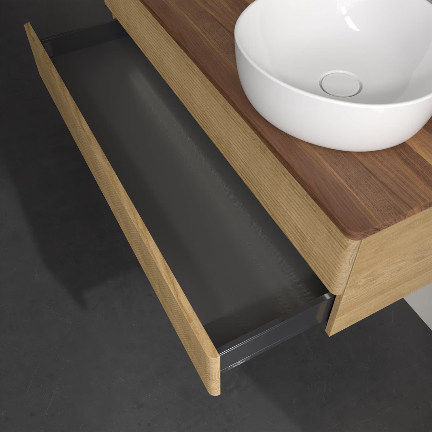 Der wandhängende Antao Waschtischunterschrank von Villeroy & Boch bietet nicht nur jede Menge Stauraum – er ist dank seines naturinspirierten Designs mit seinen abgerundeten Kanten auch noch besonders stilvoll und schafft eine gemütliche Atmosphäre im Badezimmer. Auf der Waschtischplatte bietet sich seitlich des Waschtischs viel Platz für Zahnbürstenbecher oder Seifenspender. Zwei geräumige Auszüge bieten viel Platz, um alles Notwendige zu verstauen und Ordnung zu halten. Öffnen lassen sie sich durch leichten Druck auf die strukturierte Front. Dabei aktiviert sich übrigens die Auszugsbeleuchtung in angenehmem Warmweiß. Dank Vollauszug hat man immer alles im Blick und der Antirutschboden verhindert ein Umfallen oder Verrutschen der Gegenstände. Einfach clever! Für eine besonders leichte Pflege sorgt die mehrschichtig deckend lackierte Oberfläche. Bei der Ausführung in Massivholz wird dank des verarbeiteten Massivholzes jedes Möbel zu einem Unikat, das sich durch das lebendige Naturmaterial durch seine einzigartige Struktur und Maserung auszeichnet.
