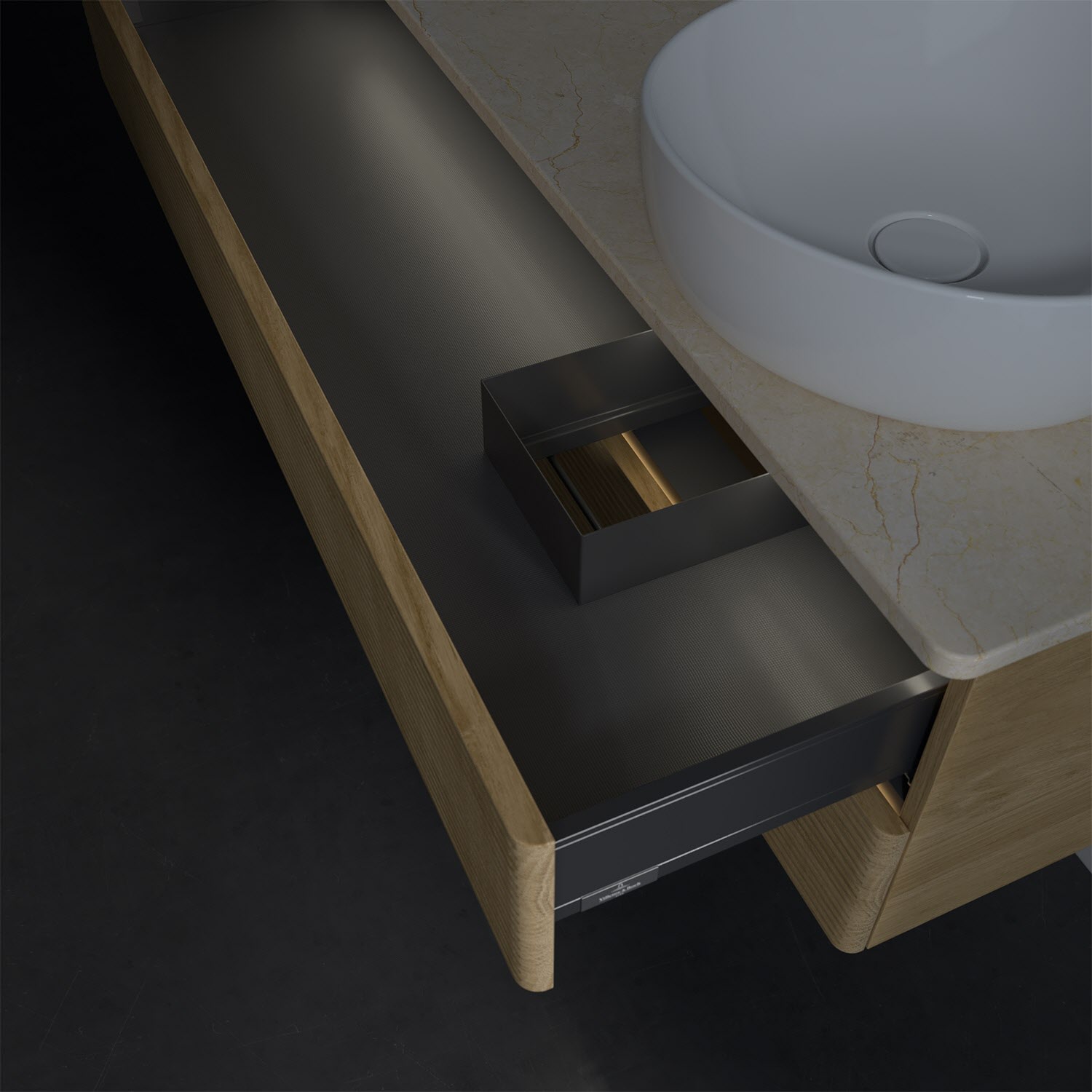 - in Schublade integrierte LED-Leiste mit warmweißem Licht zur Beleuchtung des Innenlebens