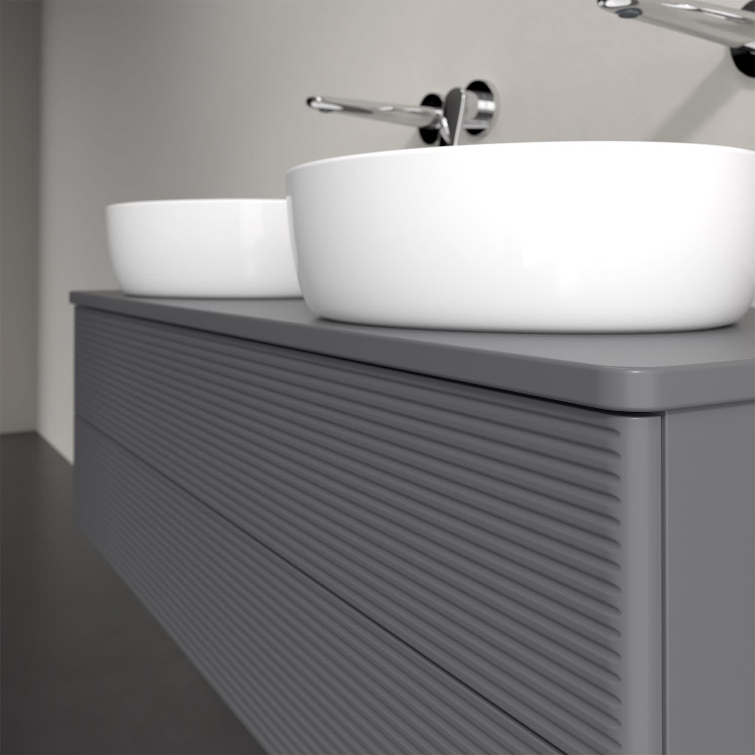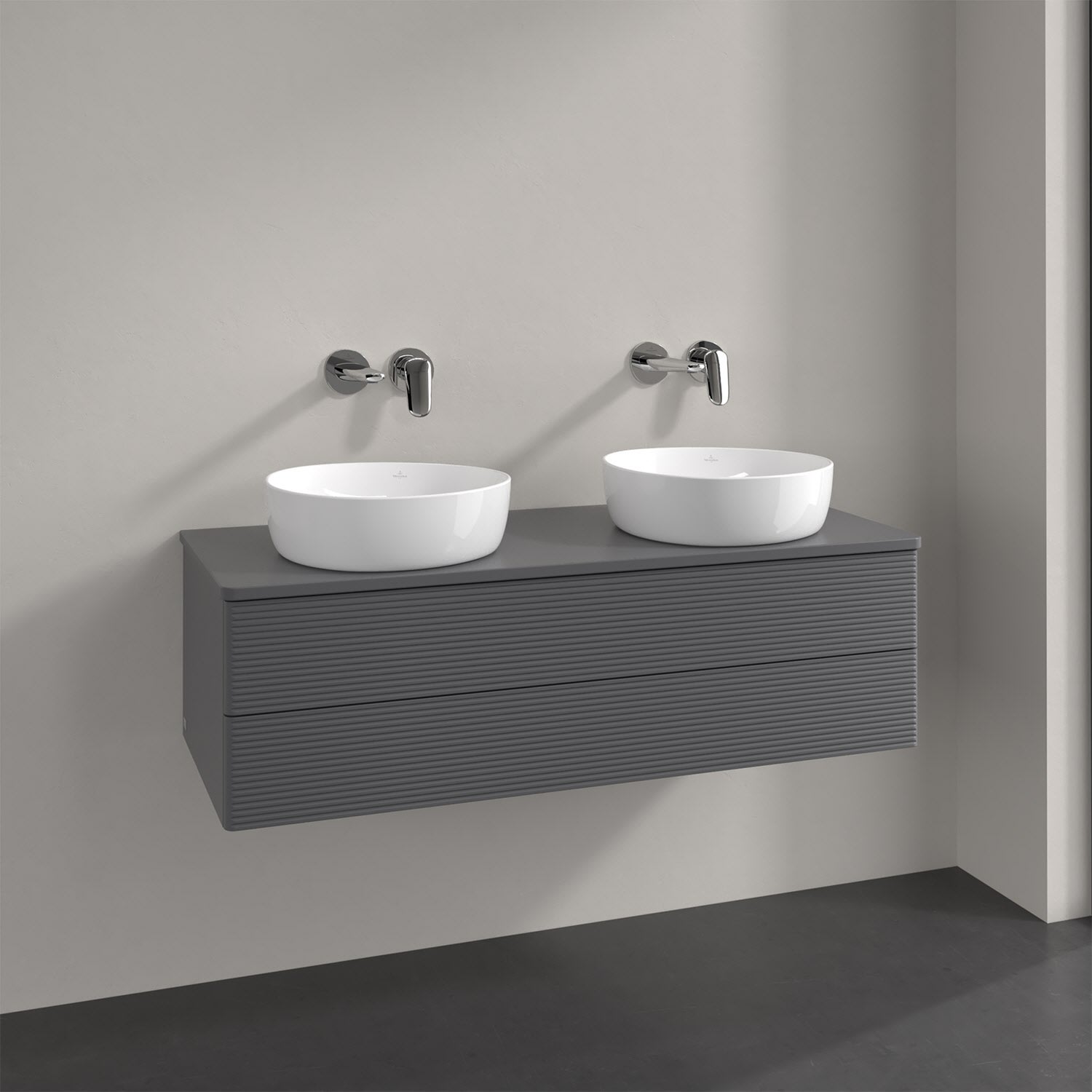 Der wandhängende Antao Waschtischunterschrank von Villeroy & Boch bietet nicht nur jede Menge Stauraum – er ist dank seines naturinspirierten Designs mit seinen abgerundeten Kanten auch noch besonders stilvoll und schafft eine gemütliche Atmosphäre im Badezimmer. Kombiniert mit zwei passenden Aufsatzwaschtischen also die ideale Wahl. Zwei geräumige Auszüge bieten viel Platz, um alles Notwendige zu verstauen und Ordnung zu halten. Öffnen lassen sie sich durch leichten Druck auf die strukturierte Front. Dabei aktiviert sich übrigens die Auszugsbeleuchtung in angenehmem Warmweiß. Dank Vollauszug hat man immer alles im Blick und der Antirutschboden verhindert ein Umfallen oder Verrutschen der Gegenstände. Einfach clever! Für eine besonders leichte Pflege sorgt die mehrschichtig deckend lackierte Oberfläche.