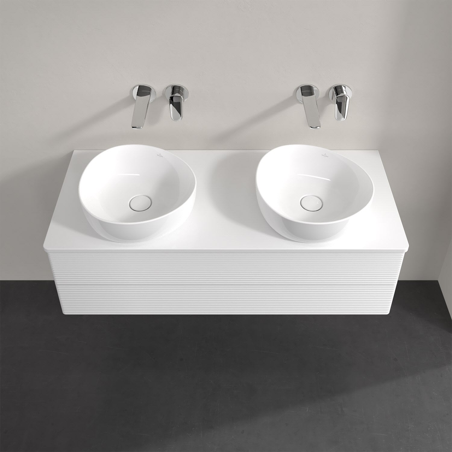 Der wandhängende Antao Waschtischunterschrank von Villeroy & Boch bietet nicht nur jede Menge Stauraum – er ist dank seines naturinspirierten Designs mit seinen abgerundeten Kanten auch noch besonders stilvoll und schafft eine gemütliche Atmosphäre im Badezimmer. Kombiniert mit zwei passenden Aufsatzwaschtischen also die ideale Wahl. Zwei geräumige Auszüge bieten viel Platz, um alles Notwendige zu verstauen und Ordnung zu halten. Öffnen lassen sie sich durch leichten Druck auf die strukturierte Front. Dabei aktiviert sich übrigens die Auszugsbeleuchtung in angenehmem Warmweiß. Dank Vollauszug hat man immer alles im Blick und der Antirutschboden verhindert ein Umfallen oder Verrutschen der Gegenstände. Einfach clever! Für eine besonders leichte Pflege sorgt die mehrschichtig deckend lackierte Oberfläche.