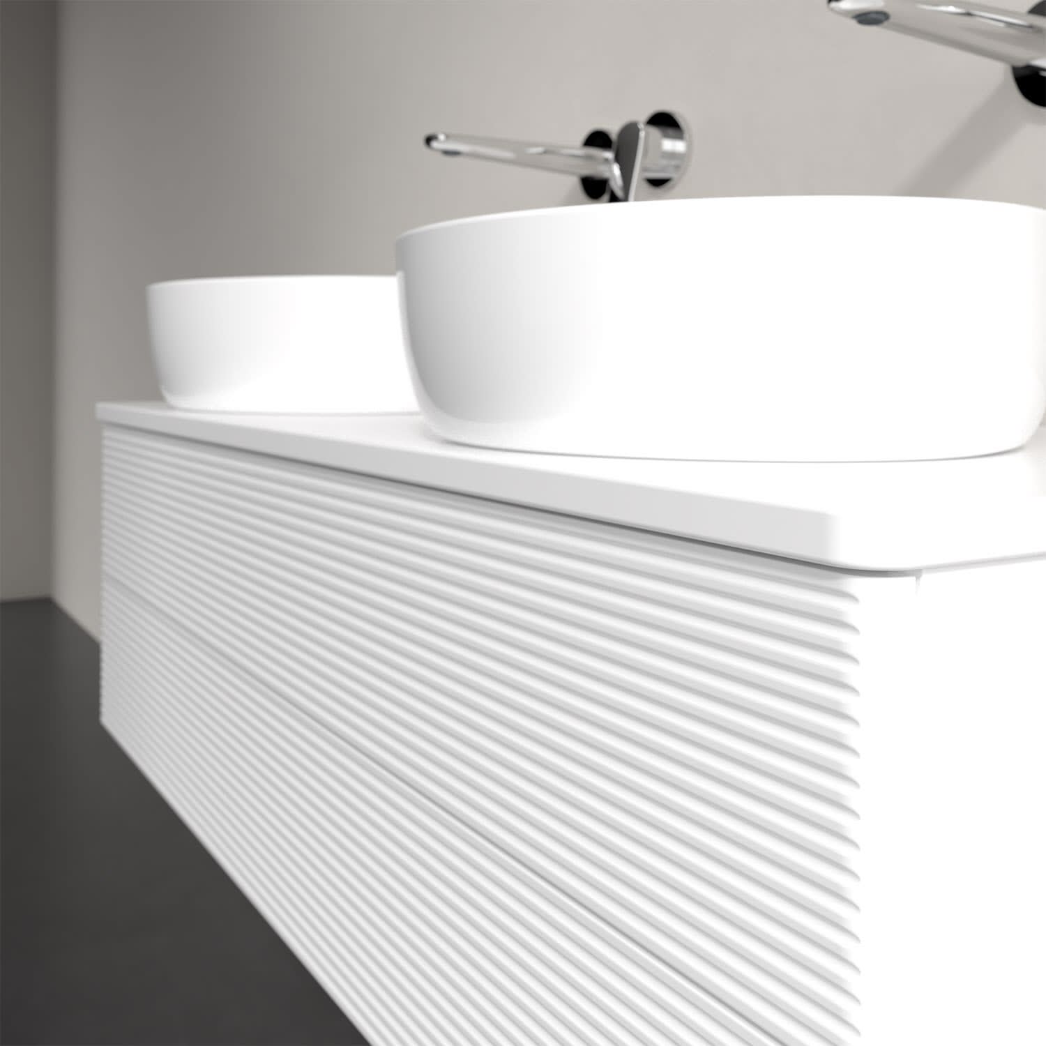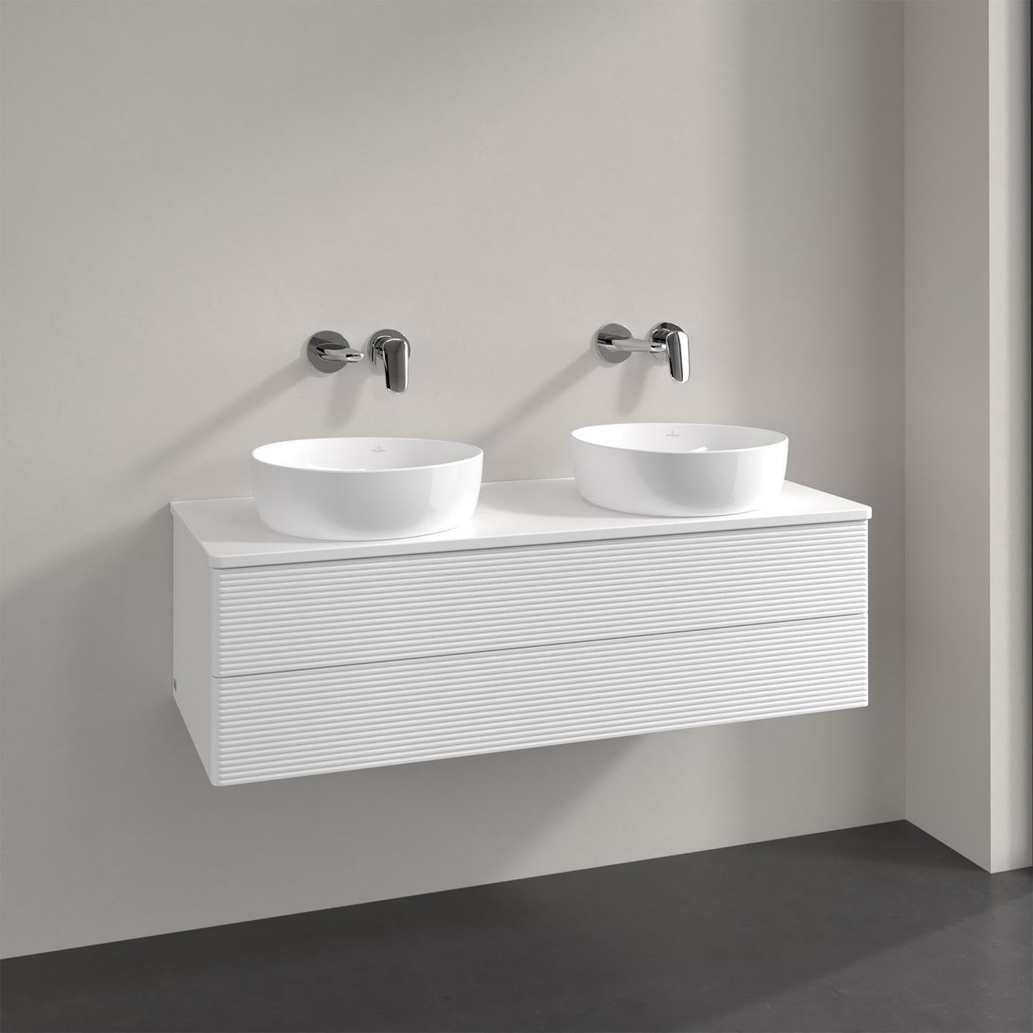 Der wandhängende Antao Waschtischunterschrank von Villeroy & Boch bietet nicht nur jede Menge Stauraum – er ist dank seines naturinspirierten Designs mit seinen abgerundeten Kanten auch noch besonders stilvoll und schafft eine gemütliche Atmosphäre im Badezimmer. Kombiniert mit zwei passenden Aufsatzwaschtischen also die ideale Wahl. Zwei geräumige Auszüge bieten viel Platz, um alles Notwendige zu verstauen und Ordnung zu halten. Öffnen lassen sie sich durch leichten Druck auf die strukturierte Front. Dabei aktiviert sich übrigens die Auszugsbeleuchtung in angenehmem Warmweiß. Dank Vollauszug hat man immer alles im Blick und der Antirutschboden verhindert ein Umfallen oder Verrutschen der Gegenstände. Einfach clever! Für eine besonders leichte Pflege sorgt die mehrschichtig deckend lackierte Oberfläche.