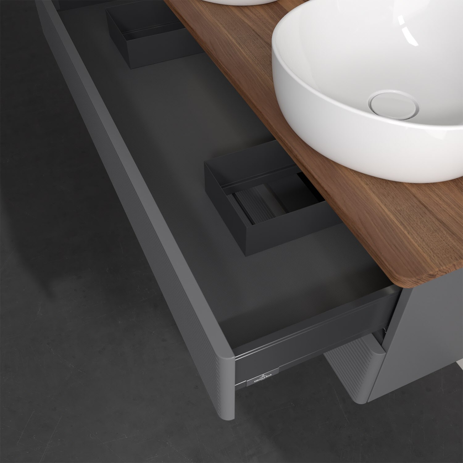 Der wandhängende Antao Waschtischunterschrank von Villeroy & Boch bietet nicht nur jede Menge Stauraum – er ist dank seines naturinspirierten Designs mit seinen abgerundeten Kanten auch noch besonders stilvoll und schafft eine gemütliche Atmosphäre im Badezimmer. Kombiniert mit zwei passenden Aufsatzwaschtischen also die ideale Wahl. Zwei geräumige Auszüge bieten viel Platz, um alles Notwendige zu verstauen und Ordnung zu halten. Öffnen lassen sie sich durch leichten Druck auf die strukturierte Front. Dabei aktiviert sich übrigens die Auszugsbeleuchtung in angenehmem Warmweiß. Dank Vollauszug hat man immer alles im Blick und der Antirutschboden verhindert ein Umfallen oder Verrutschen der Gegenstände. Einfach clever! Für eine besonders leichte Pflege sorgt die mehrschichtig deckend lackierte Oberfläche. Bei der Ausführung in Massivholz wird dank des verarbeiteten Massivholzes jedes Möbel zu einem Unikat, das sich durch das lebendige Naturmaterial durch seine einzigartige Struktur und Maserung auszeichnet.