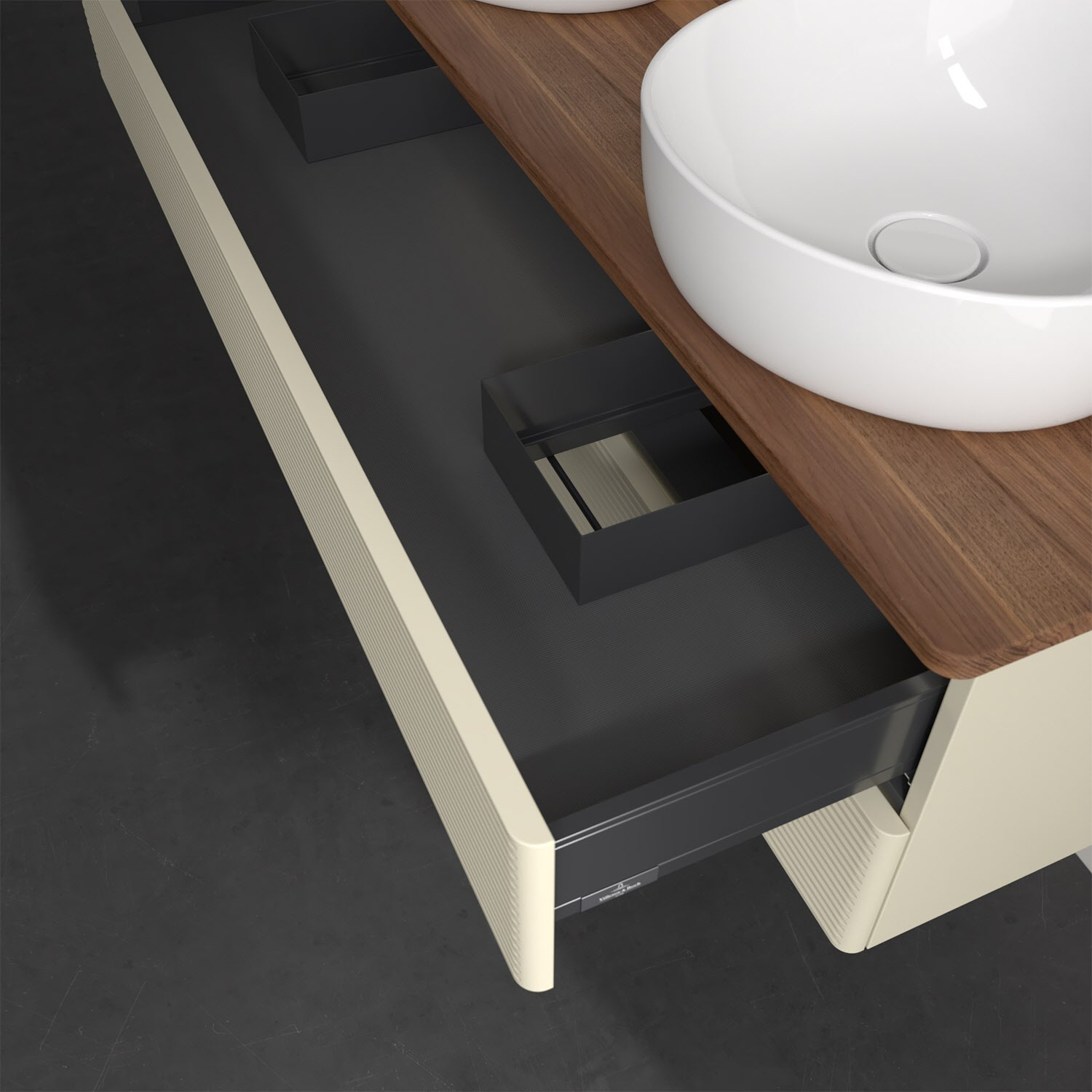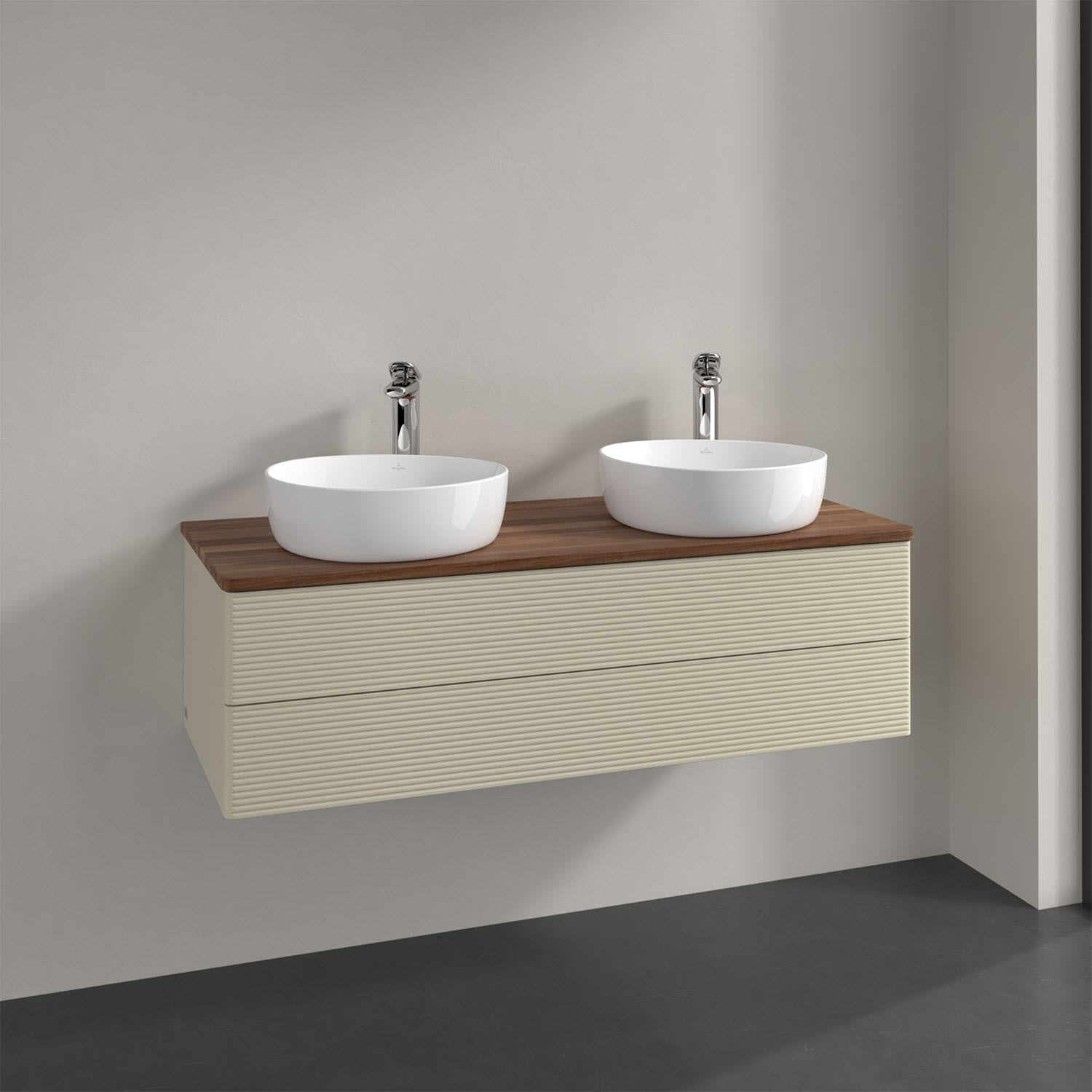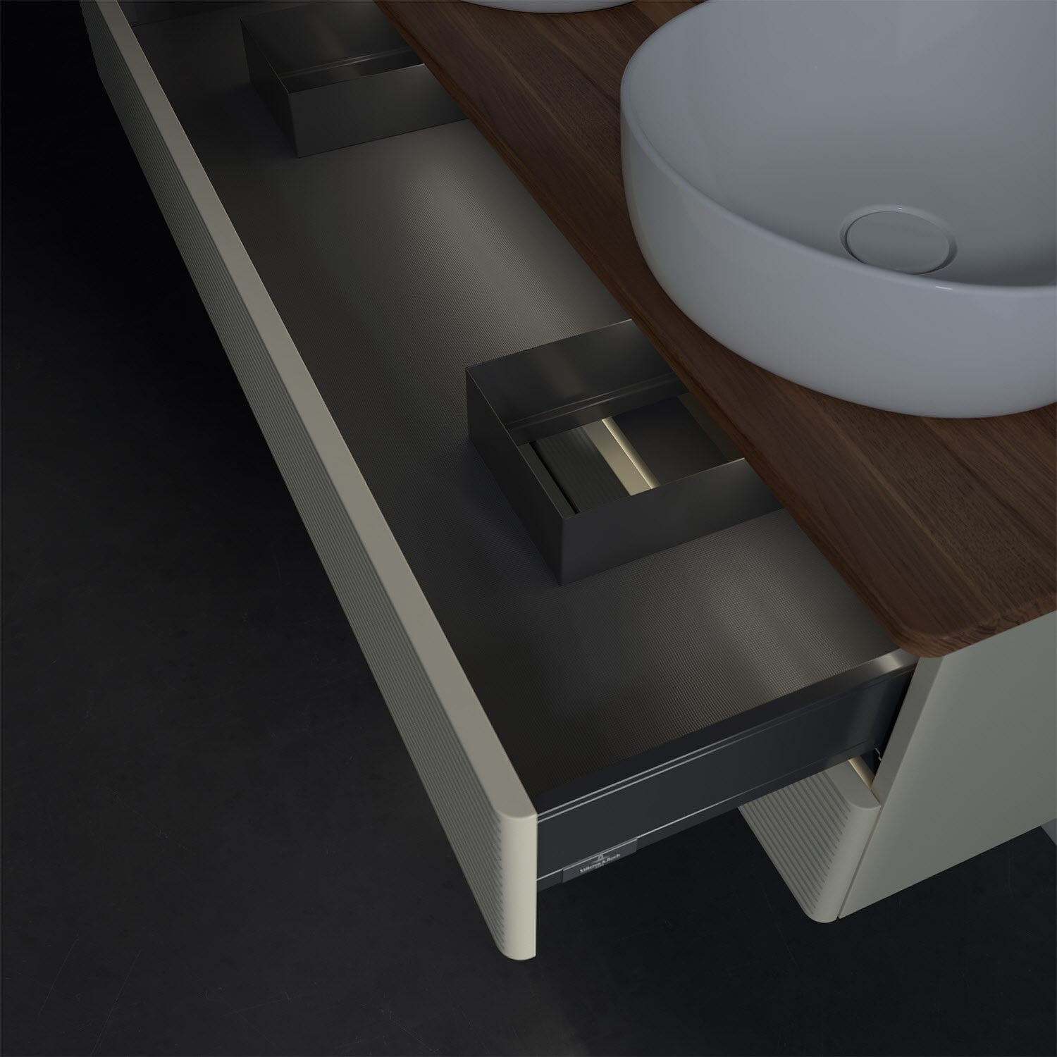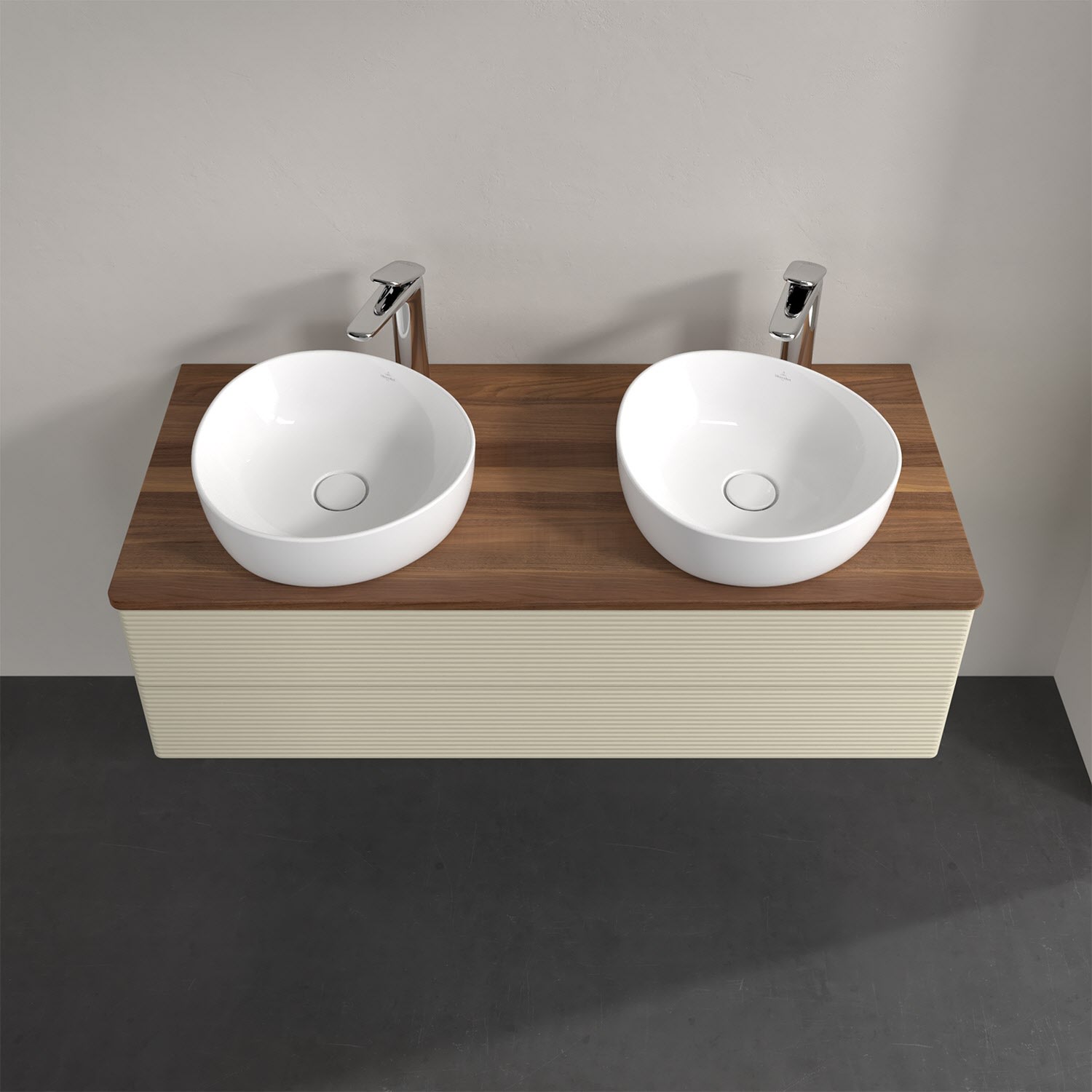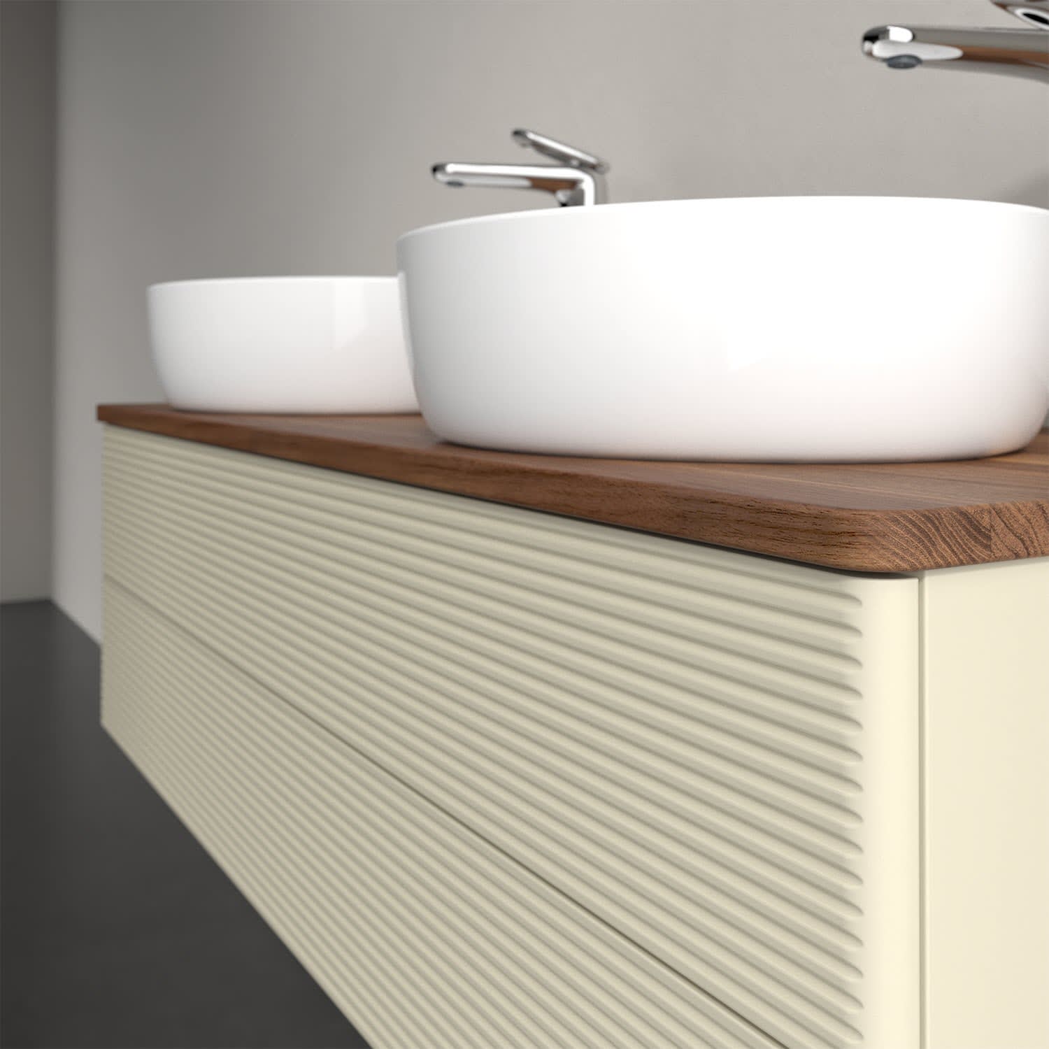 Der wandhängende Antao Waschtischunterschrank von Villeroy & Boch bietet nicht nur jede Menge Stauraum – er ist dank seines naturinspirierten Designs mit seinen abgerundeten Kanten auch noch besonders stilvoll und schafft eine gemütliche Atmosphäre im Badezimmer. Kombiniert mit zwei passenden Aufsatzwaschtischen also die ideale Wahl. Zwei geräumige Auszüge bieten viel Platz, um alles Notwendige zu verstauen und Ordnung zu halten. Öffnen lassen sie sich durch leichten Druck auf die strukturierte Front. Dabei aktiviert sich übrigens die Auszugsbeleuchtung in angenehmem Warmweiß. Dank Vollauszug hat man immer alles im Blick und der Antirutschboden verhindert ein Umfallen oder Verrutschen der Gegenstände. Einfach clever! Für eine besonders leichte Pflege sorgt die mehrschichtig deckend lackierte Oberfläche. Bei der Ausführung in Massivholz wird dank des verarbeiteten Massivholzes jedes Möbel zu einem Unikat, das sich durch das lebendige Naturmaterial durch seine einzigartige Struktur und Maserung auszeichnet.