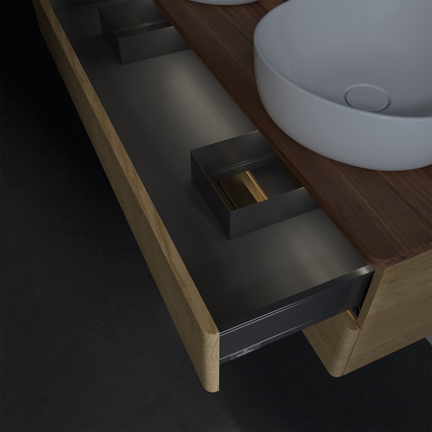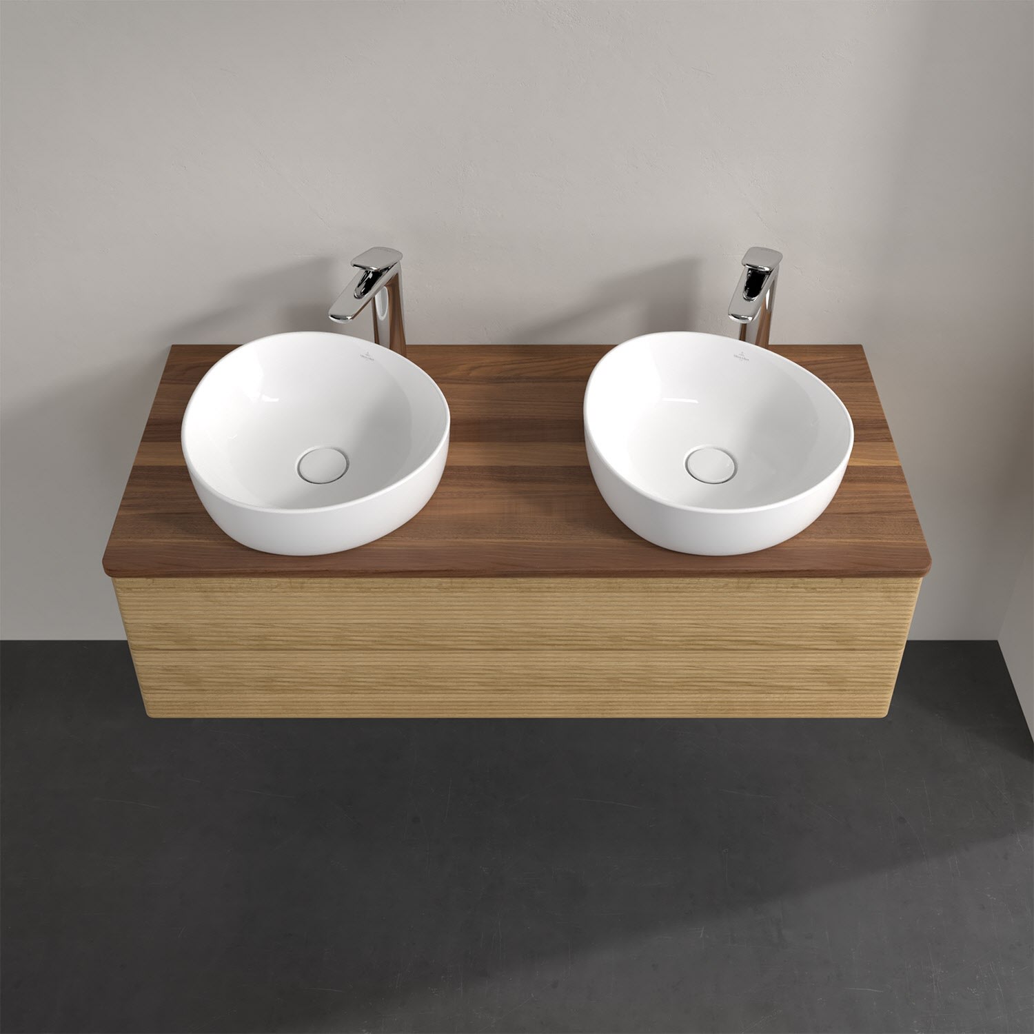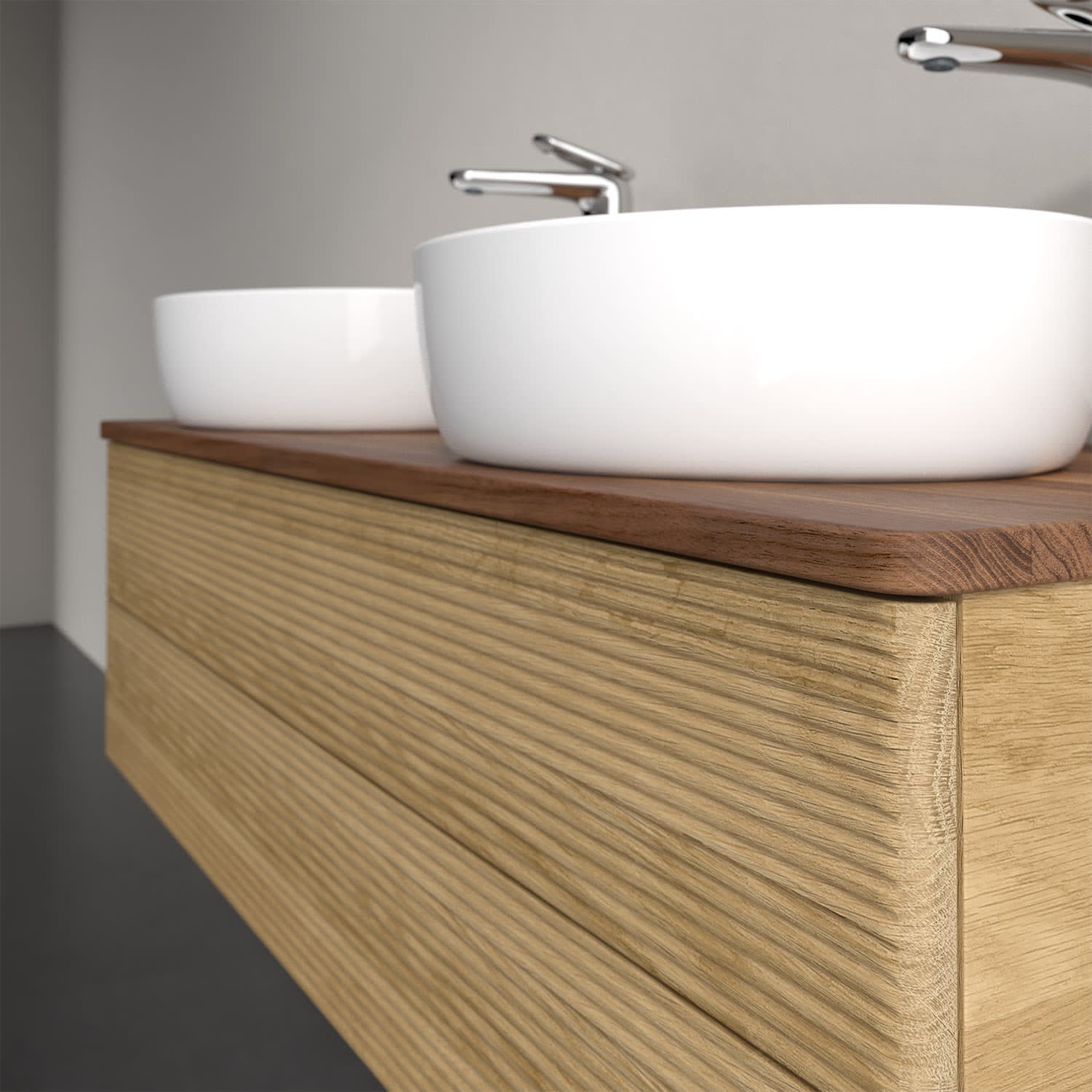 Der wandhängende Antao Waschtischunterschrank von Villeroy & Boch bietet nicht nur jede Menge Stauraum – er ist dank seines naturinspirierten Designs mit seinen abgerundeten Kanten auch noch besonders stilvoll und schafft eine gemütliche Atmosphäre im Badezimmer. Kombiniert mit zwei passenden Aufsatzwaschtischen also die ideale Wahl. Zwei geräumige Auszüge bieten viel Platz, um alles Notwendige zu verstauen und Ordnung zu halten. Öffnen lassen sie sich durch leichten Druck auf die strukturierte Front. Dabei aktiviert sich übrigens die Auszugsbeleuchtung in angenehmem Warmweiß. Dank Vollauszug hat man immer alles im Blick und der Antirutschboden verhindert ein Umfallen oder Verrutschen der Gegenstände. Einfach clever! Für eine besonders leichte Pflege sorgt die mehrschichtig deckend lackierte Oberfläche. Bei der Ausführung in Massivholz wird dank des verarbeiteten Massivholzes jedes Möbel zu einem Unikat, das sich durch das lebendige Naturmaterial durch seine einzigartige Struktur und Maserung auszeichnet.