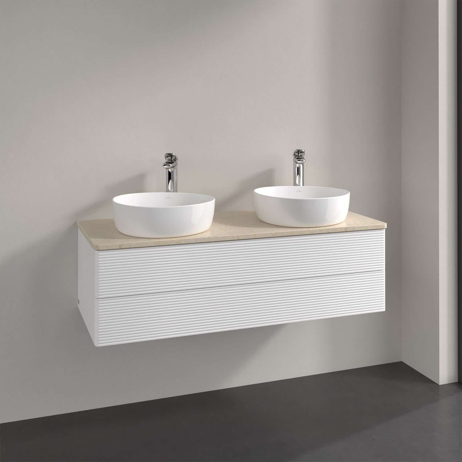 Der wandhängende Antao Waschtischunterschrank von Villeroy & Boch bietet nicht nur jede Menge Stauraum – er ist dank seines naturinspirierten Designs mit seinen abgerundeten Kanten auch noch besonders stilvoll und schafft eine gemütliche Atmosphäre im Badezimmer. Kombiniert mit zwei passenden Aufsatzwaschtischen also die ideale Wahl. Zwei geräumige Auszüge bieten viel Platz, um alles Notwendige zu verstauen und Ordnung zu halten. Öffnen lassen sie sich durch leichten Druck auf die strukturierte Front. Dabei aktiviert sich übrigens die Auszugsbeleuchtung in angenehmem Warmweiß. Dank Vollauszug hat man immer alles im Blick und der Antirutschboden verhindert ein Umfallen oder Verrutschen der Gegenstände. Einfach clever! Für eine besonders leichte Pflege sorgt die mehrschichtig deckend lackierte Oberfläche. Bei der Ausführung in Massivholz wird dank des verarbeiteten Massivholzes jedes Möbel zu einem Unikat, das sich durch das lebendige Naturmaterial durch seine einzigartige Struktur und Maserung auszeichnet.
