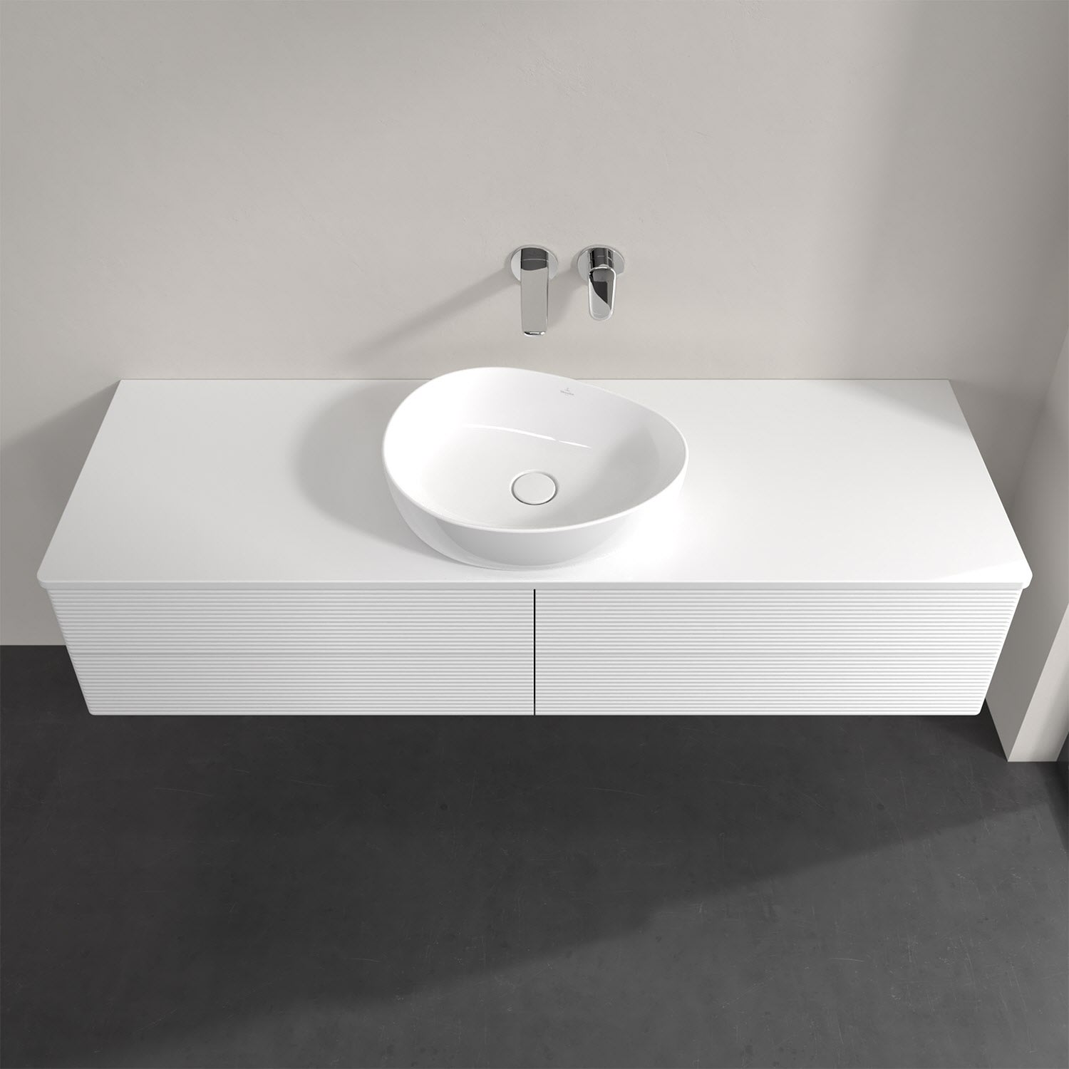 Der wandhängende Antao Waschtischunterschrank bietet mit seinen vier Auszügen und seiner erstaunlichen Größe viel Platz zum Verstauen von Utensilien im Badezimmer. Dank des mittig platzierten Aufsatzwaschtischs gibt es seitlich weiteren Platz für Handtücher, Seifenspender & Co. auf der Waschtischplatte. Inspiriert von der Natur überzeugt der Unterschrank auch optisch mit sanfter Formsprache und abgerundete Kanten. Die grifflosen Auszüge mit strukturierter Front sind mit der Push-to-Open Funktion ausgestattet und verfügen über einen Antirutschboden, damit Utensilien sicher verstaut werden können. Den Überblick behält man dank der warmweißen Auszugsbeleuchtung, die sich automatisch beim Öffnen einschaltet. Mit seiner Vollauszug- und Selbsteinzug-Funktion ist der Schrank einfach praktisch und leicht zu bedienen. Qualität von Villeroy & Boch! Für eine besonders leichte Pflege sorgt die mehrschichtig deckend lackierte Oberfläche.