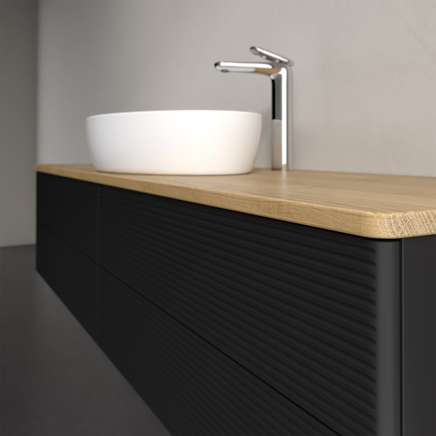 Der wandhängende Antao Waschtischunterschrank bietet mit seinen vier Auszügen und seiner erstaunlichen Größe viel Platz zum Verstauen von Utensilien im Badezimmer. Dank des mittig platzierten Aufsatzwaschtischs gibt es seitlich weiteren Platz für Handtücher, Seifenspender & Co. auf der Waschtischplatte. Inspiriert von der Natur überzeugt der Unterschrank auch optisch mit sanfter Formsprache und abgerundete Kanten. Die grifflosen Auszüge mit strukturierter Front sind mit der Push-to-Open Funktion ausgestattet und verfügen über einen Antirutschboden, damit Utensilien sicher verstaut werden können. Den Überblick behält man dank der warmweißen Auszugsbeleuchtung, die sich automatisch beim Öffnen einschaltet. Mit seiner Vollauszug- und Selbsteinzug-Funktion ist der Schrank einfach praktisch und leicht zu bedienen. Qualität von Villeroy & Boch! Für eine besonders leichte Pflege sorgt die mehrschichtig deckend lackierte Oberfläche. Bei der Ausführung in Massivholz wird dank des verarbeiteten Massivholzes jedes Möbel zu einem Unikat, das sich durch das lebendige Naturmaterial durch seine einzigartige Struktur und Maserung auszeichnet.