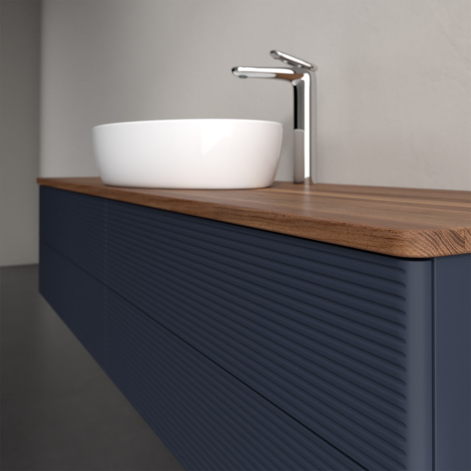 Der wandhängende Antao Waschtischunterschrank bietet mit seinen vier Auszügen und seiner erstaunlichen Größe viel Platz zum Verstauen von Utensilien im Badezimmer. Dank des mittig platzierten Aufsatzwaschtischs gibt es seitlich weiteren Platz für Handtücher, Seifenspender & Co. auf der Waschtischplatte. Inspiriert von der Natur überzeugt der Unterschrank auch optisch mit sanfter Formsprache und abgerundete Kanten. Die grifflosen Auszüge mit strukturierter Front sind mit der Push-to-Open Funktion ausgestattet und verfügen über einen Antirutschboden, damit Utensilien sicher verstaut werden können. Den Überblick behält man dank der warmweißen Auszugsbeleuchtung, die sich automatisch beim Öffnen einschaltet. Mit seiner Vollauszug- und Selbsteinzug-Funktion ist der Schrank einfach praktisch und leicht zu bedienen. Qualität von Villeroy & Boch! Für eine besonders leichte Pflege sorgt die mehrschichtig deckend lackierte Oberfläche. Bei der Ausführung in Massivholz wird dank des verarbeiteten Massivholzes jedes Möbel zu einem Unikat, das sich durch das lebendige Naturmaterial durch seine einzigartige Struktur und Maserung auszeichnet.