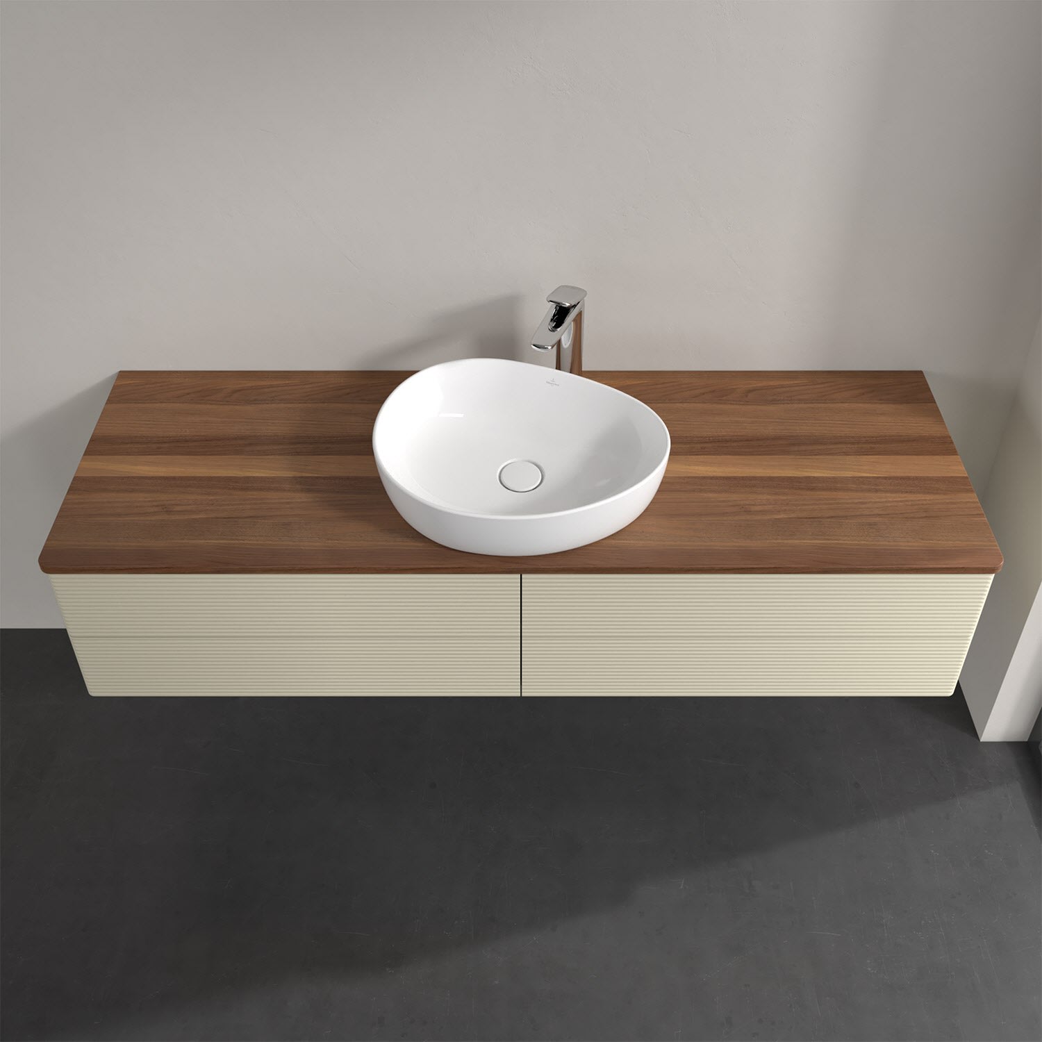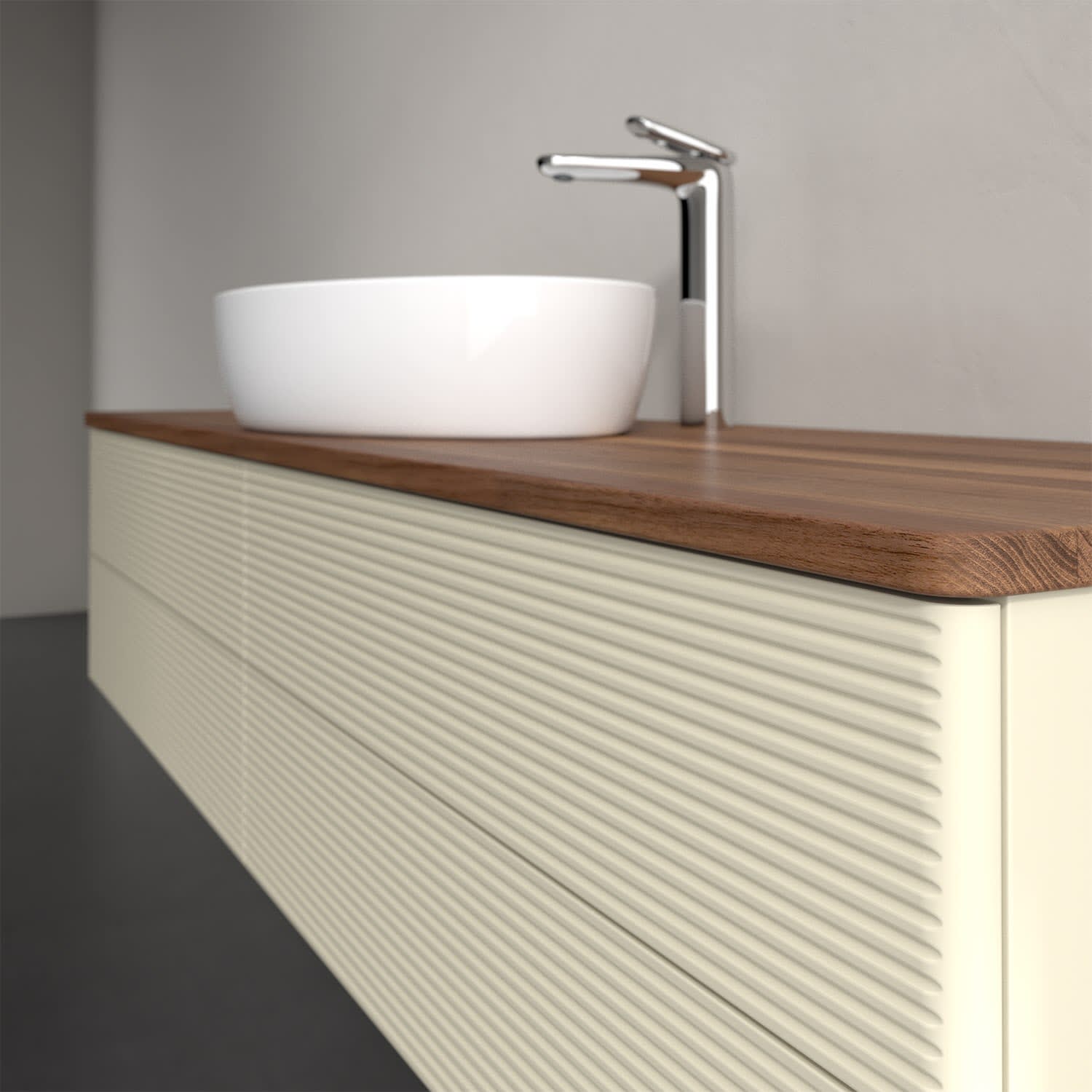 Der wandhängende Antao Waschtischunterschrank bietet mit seinen vier Auszügen und seiner erstaunlichen Größe viel Platz zum Verstauen von Utensilien im Badezimmer. Dank des mittig platzierten Aufsatzwaschtischs gibt es seitlich weiteren Platz für Handtücher, Seifenspender & Co. auf der Waschtischplatte. Inspiriert von der Natur überzeugt der Unterschrank auch optisch mit sanfter Formsprache und abgerundete Kanten. Die grifflosen Auszüge mit strukturierter Front sind mit der Push-to-Open Funktion ausgestattet und verfügen über einen Antirutschboden, damit Utensilien sicher verstaut werden können. Den Überblick behält man dank der warmweißen Auszugsbeleuchtung, die sich automatisch beim Öffnen einschaltet. Mit seiner Vollauszug- und Selbsteinzug-Funktion ist der Schrank einfach praktisch und leicht zu bedienen. Qualität von Villeroy & Boch! Für eine besonders leichte Pflege sorgt die mehrschichtig deckend lackierte Oberfläche. Bei der Ausführung in Massivholz wird dank des verarbeiteten Massivholzes jedes Möbel zu einem Unikat, das sich durch das lebendige Naturmaterial durch seine einzigartige Struktur und Maserung auszeichnet.