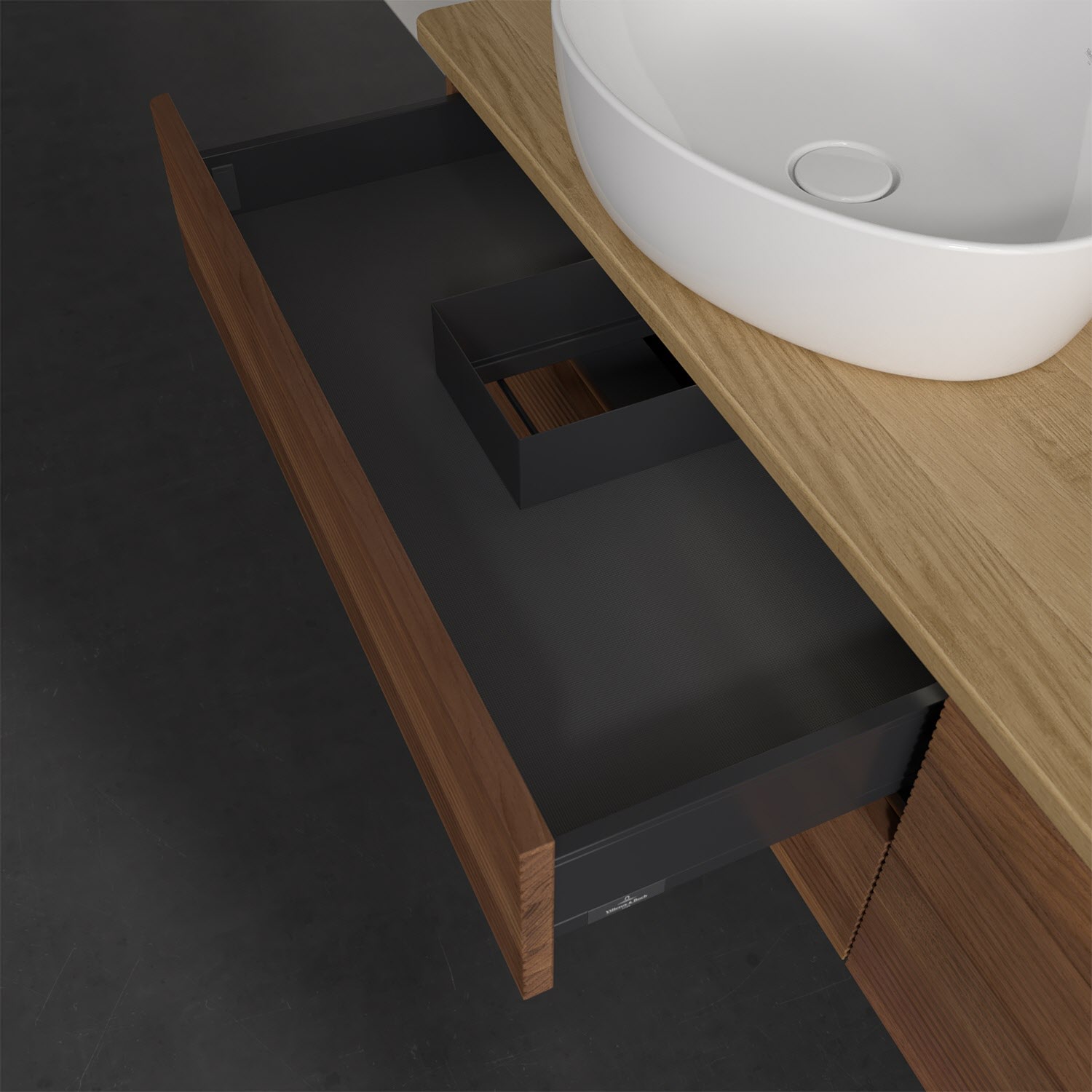 Der wandhängende Antao Waschtischunterschrank bietet mit seinen vier Auszügen und seiner erstaunlichen Größe viel Platz zum Verstauen von Utensilien im Badezimmer. Dank des seitlich platzierten Aufsatzwaschtischs gibt es daneben weiteren Platz für Handtücher, Seifenspender & Co. auf der Waschtischplatte. Inspiriert von der Natur überzeugt der Unterschrank auch optisch mit sanfter Formsprache und abgerundete Kanten. Die grifflosen Auszüge mit strukturierter Front sind mit der Push-to-Open Funktion ausgestattet und verfügen über einen Antirutschboden, damit Utensilien sicher verstaut werden können. Den Überblick behält man dank der warmweißen Auszugsbeleuchtung, die sich automatisch beim Öffnen einschaltet. Mit seiner Vollauszug- und Selbsteinzug-Funktion ist der Schrank einfach praktisch und leicht zu bedienen. Qualität von Villeroy & Boch! Für eine besonders leichte Pflege sorgt die mehrschichtig deckend lackierte Oberfläche. Bei der Ausführung in Massivholz wird dank des verarbeiteten Massivholzes jedes Möbel zu einem Unikat, das sich durch das lebendige Naturmaterial durch seine einzigartige Struktur und Maserung auszeichnet.