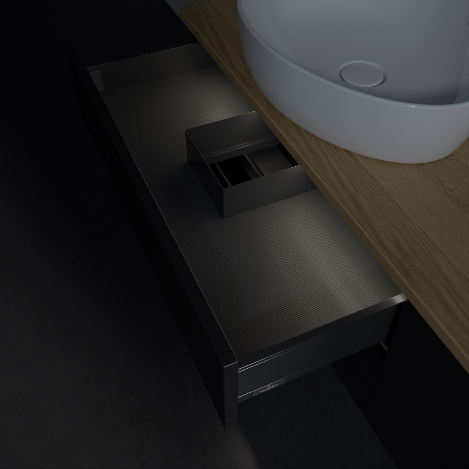 Villeroy & Boch Antao Waschbeckenunterschrank, 160 x 36 cm, 4 Auszüge mit LED-Licht, Front mit Struktur, mit Hahnloch, für Waschtisch links