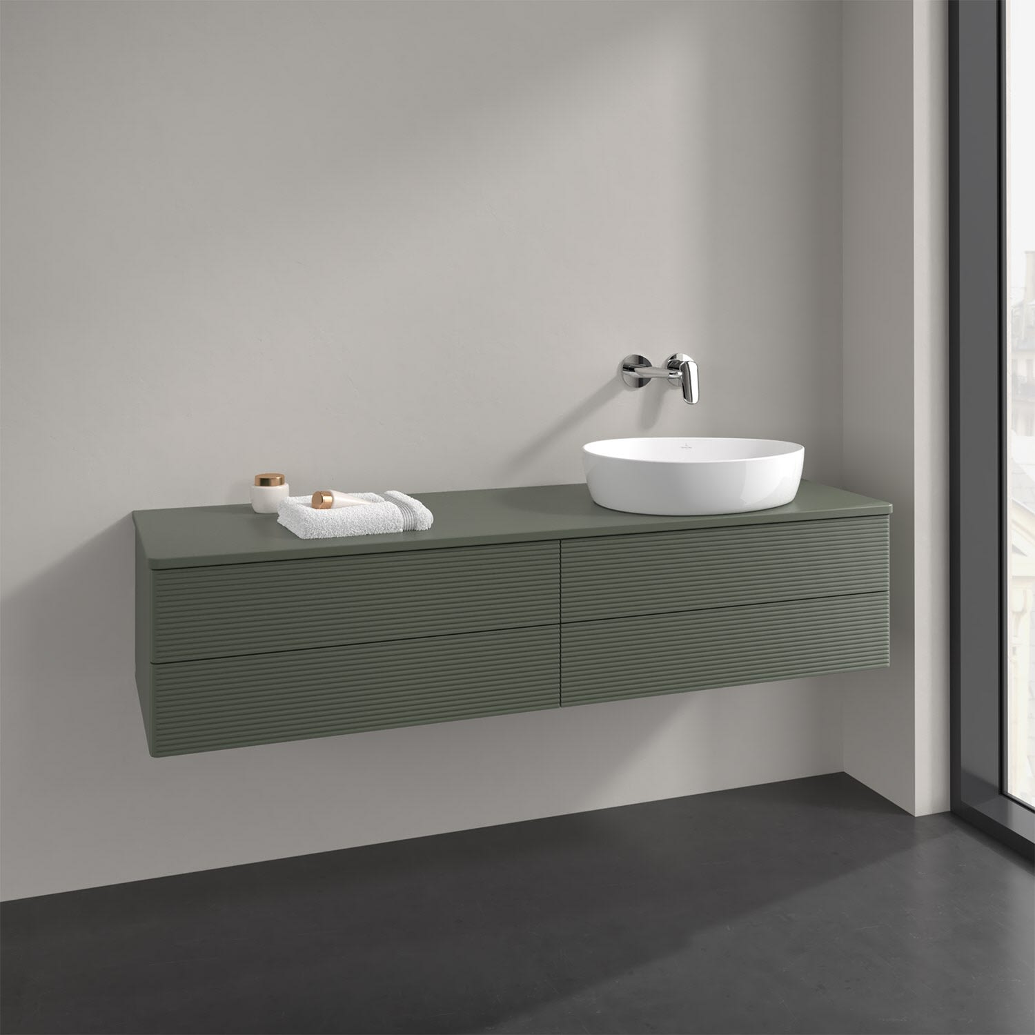 Der wandhängende Antao Waschtischunterschrank bietet mit seinen vier Auszügen und seiner erstaunlichen Größe viel Platz zum Verstauen von Utensilien im Badezimmer. Dank des seitlich platzierten Aufsatzwaschtischs gibt es daneben weiteren Platz für Handtücher, Seifenspender & Co. auf der Waschtischplatte. Inspiriert von der Natur überzeugt der Unterschrank auch optisch mit sanfter Formsprache und abgerundete Kanten. Die grifflosen Auszüge mit strukturierter Front sind mit der Push-to-Open Funktion ausgestattet und verfügen über einen Antirutschboden, damit Utensilien sicher verstaut werden können. Den Überblick behält man dank der warmweißen Auszugsbeleuchtung, die sich automatisch beim Öffnen einschaltet. Mit seiner Vollauszug- und Selbsteinzug-Funktion ist der Schrank einfach praktisch und leicht zu bedienen. Qualität von Villeroy & Boch! Für eine besonders leichte Pflege sorgt die mehrschichtig deckend lackierte Oberfläche.