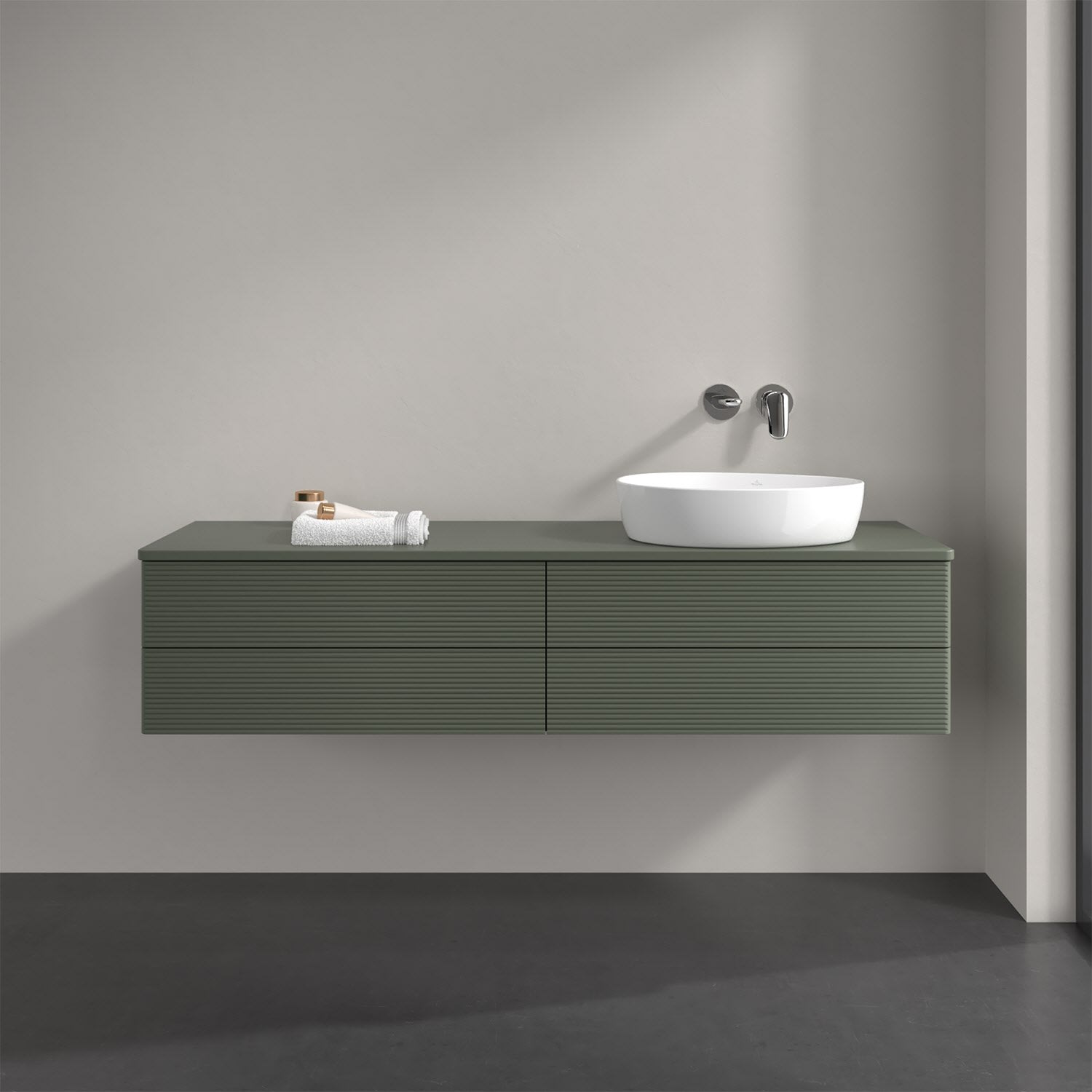 Villeroy & Boch Antao Waschbeckenunterschrank, 160 x 36 cm, 4 Auszüge mit LED-Licht, Front mit Struktur, mit Hahnloch, für Waschtisch rechts