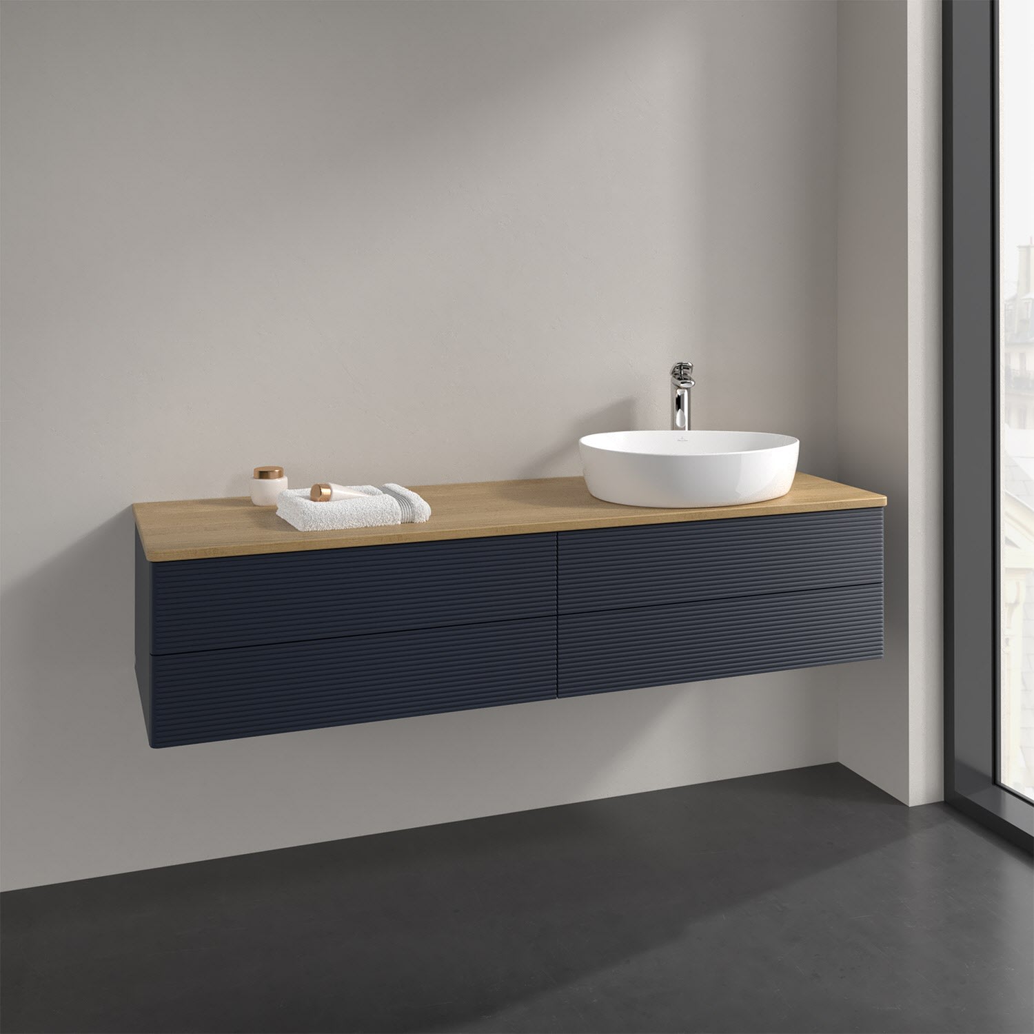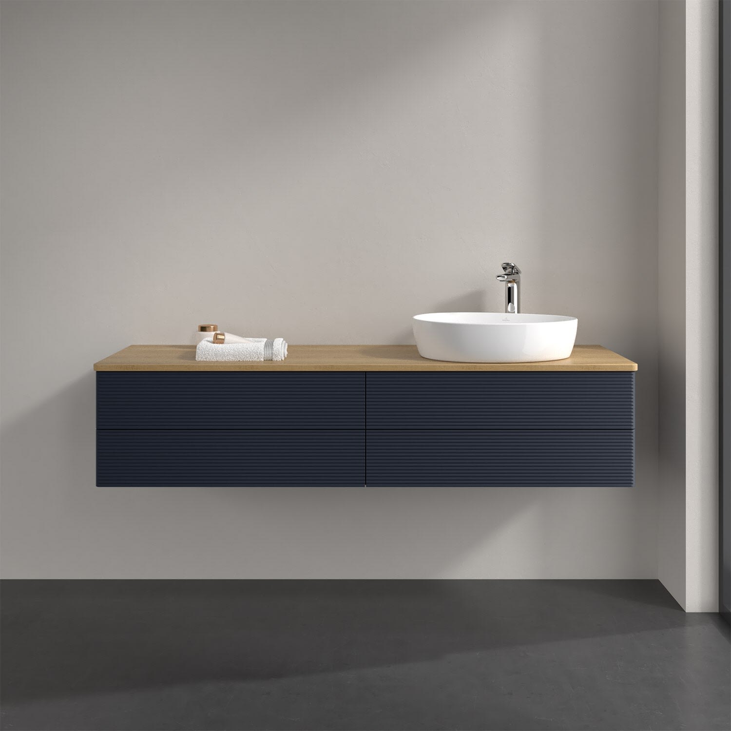 Villeroy & Boch Antao Waschbeckenunterschrank, 160 x 36 cm, 4 Auszüge mit LED-Licht, Front mit Struktur, mit Hahnloch, für Waschtisch rechts