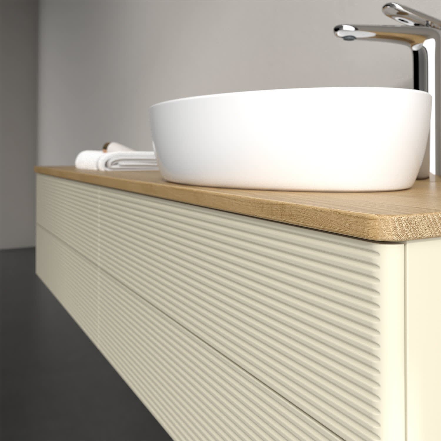 Der wandhängende Antao Waschtischunterschrank bietet mit seinen vier Auszügen und seiner erstaunlichen Größe viel Platz zum Verstauen von Utensilien im Badezimmer. Dank des seitlich platzierten Aufsatzwaschtischs gibt es daneben weiteren Platz für Handtücher, Seifenspender & Co. auf der Waschtischplatte. Inspiriert von der Natur überzeugt der Unterschrank auch optisch mit sanfter Formsprache und abgerundete Kanten. Die grifflosen Auszüge mit strukturierter Front sind mit der Push-to-Open Funktion ausgestattet und verfügen über einen Antirutschboden, damit Utensilien sicher verstaut werden können. Den Überblick behält man dank der warmweißen Auszugsbeleuchtung, die sich automatisch beim Öffnen einschaltet. Mit seiner Vollauszug- und Selbsteinzug-Funktion ist der Schrank einfach praktisch und leicht zu bedienen. Qualität von Villeroy & Boch! Für eine besonders leichte Pflege sorgt die mehrschichtig deckend lackierte Oberfläche. Bei der Ausführung in Massivholz wird dank des verarbeiteten Massivholzes jedes Möbel zu einem Unikat, das sich durch das lebendige Naturmaterial durch seine einzigartige Struktur und Maserung auszeichnet.
