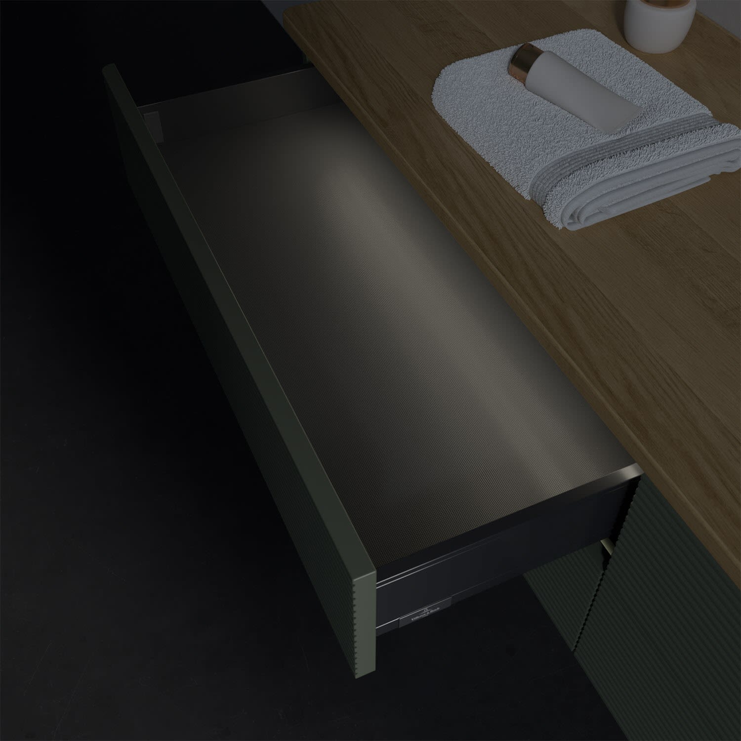 - in Schublade integrierte LED-Leiste mit warmweißem Licht zur Beleuchtung des Innenlebens
