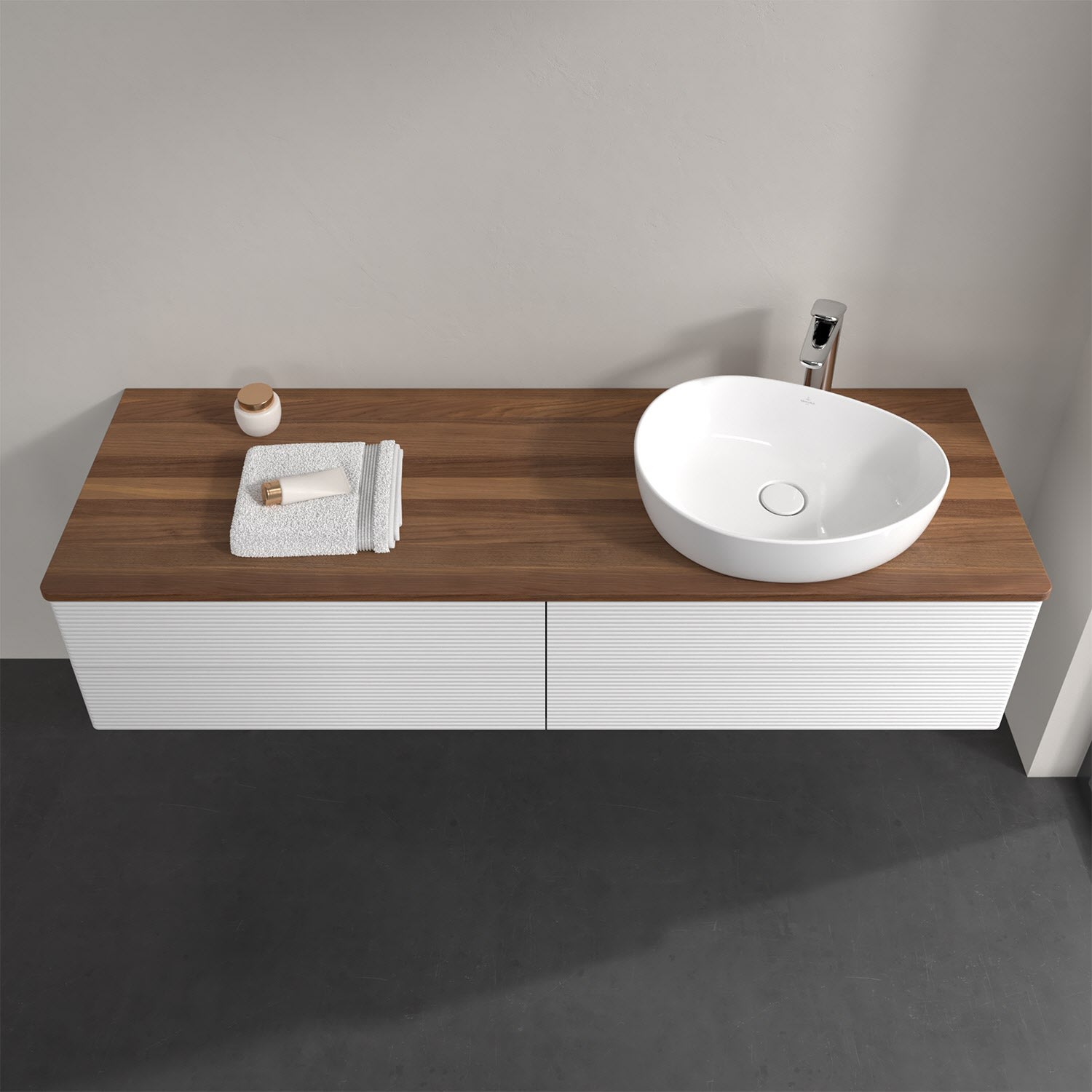 Der wandhängende Antao Waschtischunterschrank bietet mit seinen vier Auszügen und seiner erstaunlichen Größe viel Platz zum Verstauen von Utensilien im Badezimmer. Dank des seitlich platzierten Aufsatzwaschtischs gibt es daneben weiteren Platz für Handtücher, Seifenspender & Co. auf der Waschtischplatte. Inspiriert von der Natur überzeugt der Unterschrank auch optisch mit sanfter Formsprache und abgerundete Kanten. Die grifflosen Auszüge mit strukturierter Front sind mit der Push-to-Open Funktion ausgestattet und verfügen über einen Antirutschboden, damit Utensilien sicher verstaut werden können. Den Überblick behält man dank der warmweißen Auszugsbeleuchtung, die sich automatisch beim Öffnen einschaltet. Mit seiner Vollauszug- und Selbsteinzug-Funktion ist der Schrank einfach praktisch und leicht zu bedienen. Qualität von Villeroy & Boch! Für eine besonders leichte Pflege sorgt die mehrschichtig deckend lackierte Oberfläche. Bei der Ausführung in Massivholz wird dank des verarbeiteten Massivholzes jedes Möbel zu einem Unikat, das sich durch das lebendige Naturmaterial durch seine einzigartige Struktur und Maserung auszeichnet.