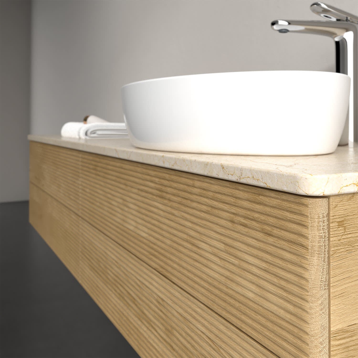 Der wandhängende Antao Waschtischunterschrank bietet mit seinen vier Auszügen und seiner erstaunlichen Größe viel Platz zum Verstauen von Utensilien im Badezimmer. Dank des seitlich platzierten Aufsatzwaschtischs gibt es daneben weiteren Platz für Handtücher, Seifenspender & Co. auf der Waschtischplatte. Inspiriert von der Natur überzeugt der Unterschrank auch optisch mit sanfter Formsprache und abgerundete Kanten. Die grifflosen Auszüge mit strukturierter Front sind mit der Push-to-Open Funktion ausgestattet und verfügen über einen Antirutschboden, damit Utensilien sicher verstaut werden können. Den Überblick behält man dank der warmweißen Auszugsbeleuchtung, die sich automatisch beim Öffnen einschaltet. Mit seiner Vollauszug- und Selbsteinzug-Funktion ist der Schrank einfach praktisch und leicht zu bedienen. Qualität von Villeroy & Boch! Für eine besonders leichte Pflege sorgt die mehrschichtig deckend lackierte Oberfläche. Bei der Ausführung in Massivholz wird dank des verarbeiteten Massivholzes jedes Möbel zu einem Unikat, das sich durch das lebendige Naturmaterial durch seine einzigartige Struktur und Maserung auszeichnet.