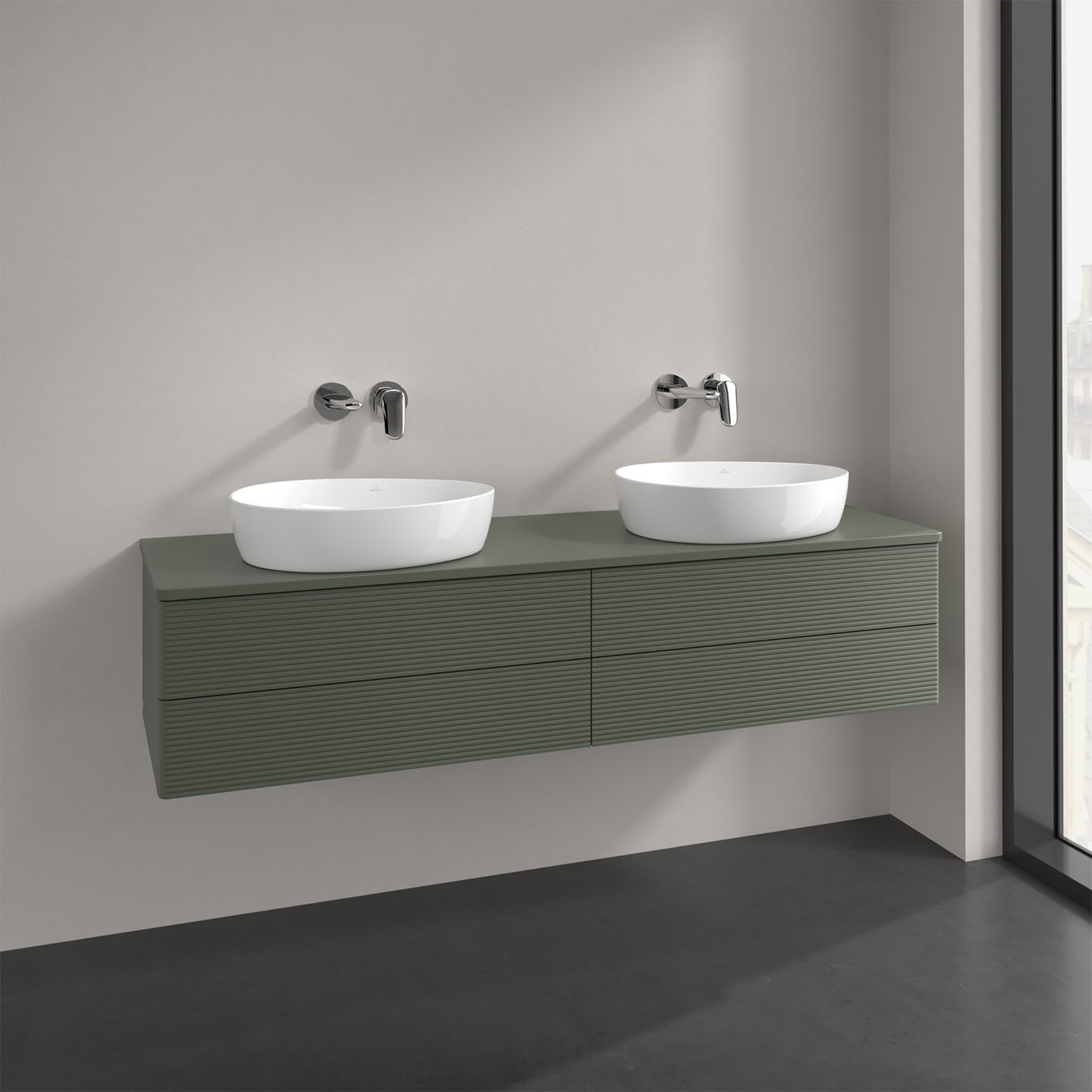 Der wandhängende Antao Waschtischunterschrank für zwei Aufsatzwaschtische bietet mit seinen vier Auszügen und seiner erstaunlichen Größe viel Platz zum Verstauen von Utensilien im Badezimmer. Inspiriert von der Natur überzeugt der Unterschrank auch optisch mit sanfter Formsprache und abgerundete Kanten. Die grifflosen Auszüge mit strukturierter Front sind mit der Push-to-Open Funktion ausgestattet und verfügen über einen Antirutschboden, damit Utensilien sicher verstaut werden können. Den Überblick behält man dank der warmweißen Auszugsbeleuchtung, die sich automatisch beim Öffnen einschaltet. Mit seiner Vollauszug- und Selbsteinzug-Funktion ist der Schrank einfach praktisch und leicht zu bedienen. Qualität von Villeroy & Boch! Für eine besonders leichte Pflege sorgt die mehrschichtig deckend lackierte Oberfläche.
