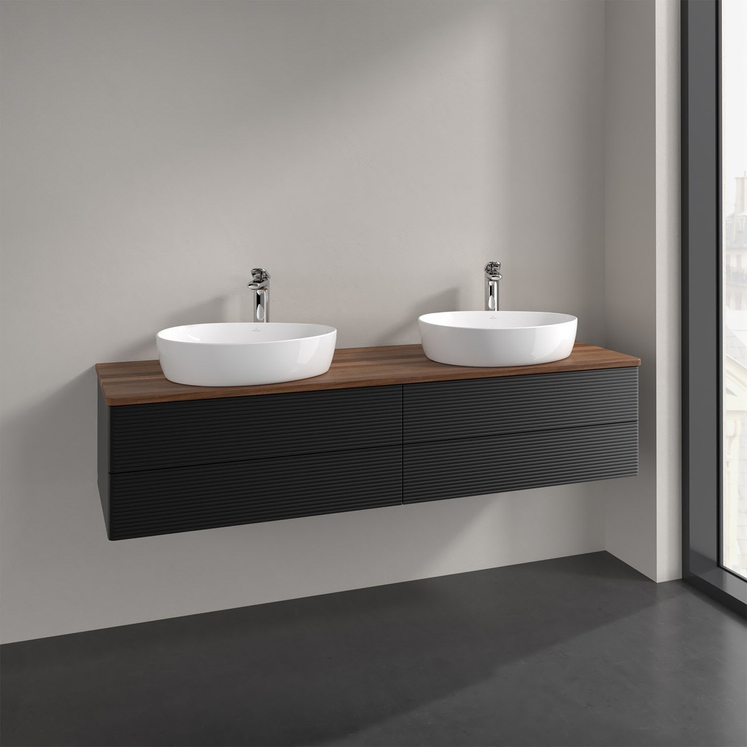 Der wandhängende Antao Waschtischunterschrank für zwei Aufsatzwaschtische bietet mit seinen vier Auszügen und seiner erstaunlichen Größe viel Platz zum Verstauen von Utensilien im Badezimmer. Inspiriert von der Natur überzeugt der Unterschrank auch optisch mit sanfter Formsprache und abgerundete Kanten. Die grifflosen Auszüge mit strukturierter Front sind mit der Push-to-Open Funktion ausgestattet und verfügen über einen Antirutschboden, damit Utensilien sicher verstaut werden können. Den Überblick behält man dank der warmweißen Auszugsbeleuchtung, die sich automatisch beim Öffnen einschaltet. Mit seiner Vollauszug- und Selbsteinzug-Funktion ist der Schrank einfach praktisch und leicht zu bedienen. Qualität von Villeroy & Boch! Für eine besonders leichte Pflege sorgt die mehrschichtig deckend lackierte Oberfläche. Bei der Ausführung in Massivholz wird dank des verarbeiteten Massivholzes jedes Möbel zu einem Unikat, das sich durch das lebendige Naturmaterial durch seine einzigartige Struktur und Maserung auszeichnet.