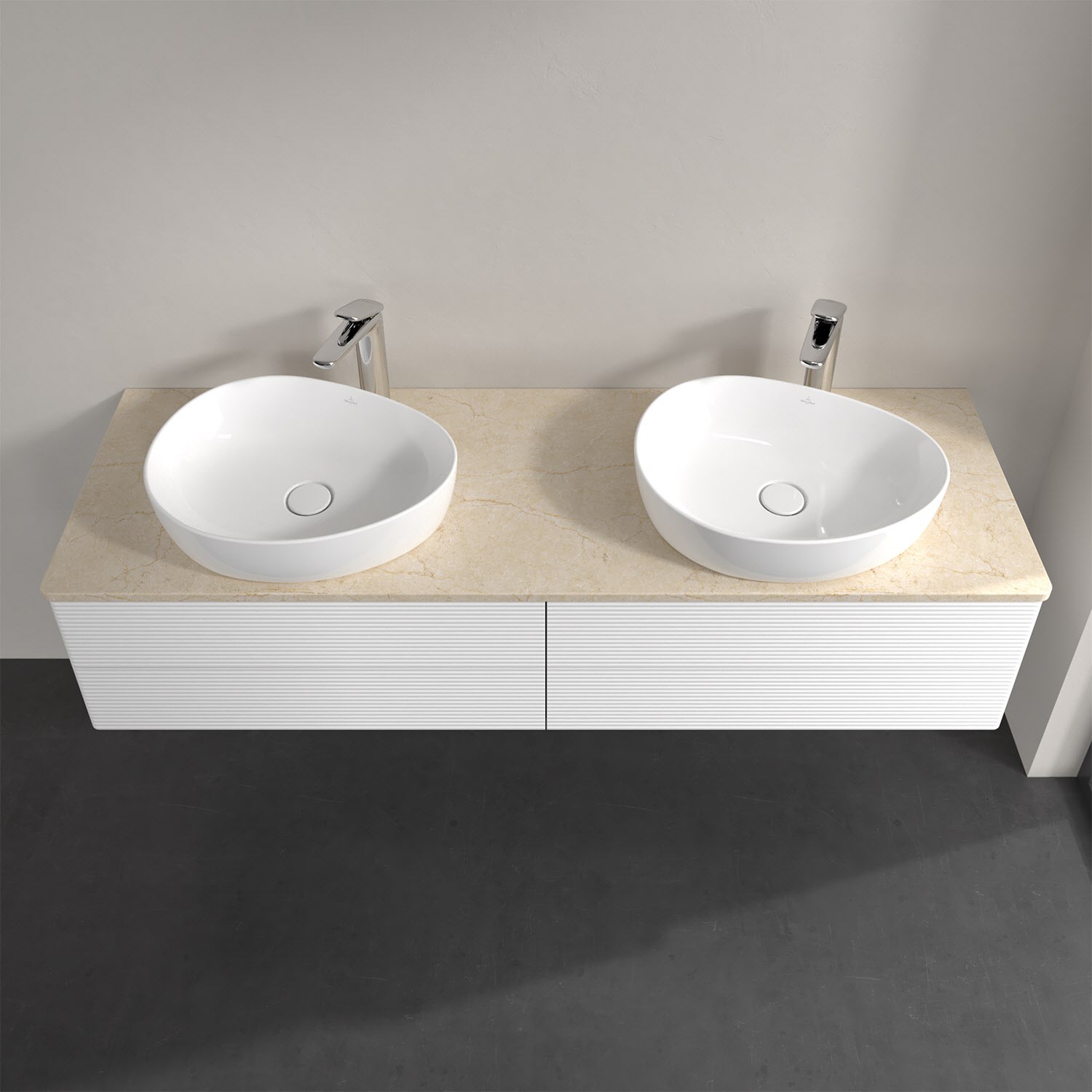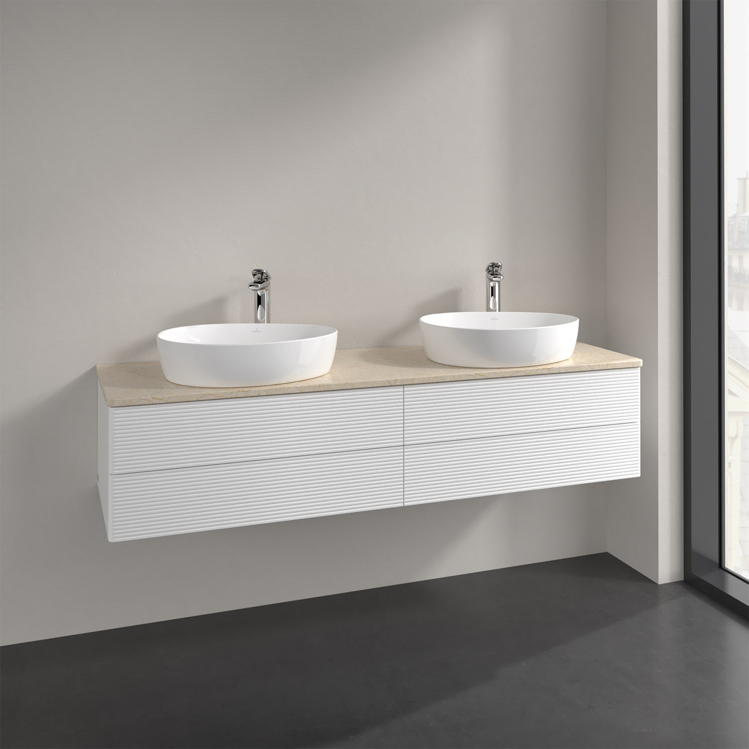 Villeroy & Boch Antao Waschbeckenunterschrank, 160 x 36 cm, 4 Auszüge mit LED-Licht, Front mit Struktur, mit Hahnloch, für Waschtisch links und rechts