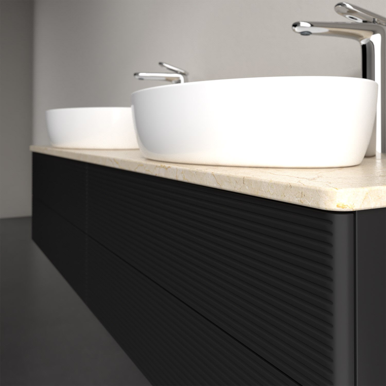 Der wandhängende Antao Waschtischunterschrank für zwei Aufsatzwaschtische bietet mit seinen vier Auszügen und seiner erstaunlichen Größe viel Platz zum Verstauen von Utensilien im Badezimmer. Inspiriert von der Natur überzeugt der Unterschrank auch optisch mit sanfter Formsprache und abgerundete Kanten. Die grifflosen Auszüge mit strukturierter Front sind mit der Push-to-Open Funktion ausgestattet und verfügen über einen Antirutschboden, damit Utensilien sicher verstaut werden können. Den Überblick behält man dank der warmweißen Auszugsbeleuchtung, die sich automatisch beim Öffnen einschaltet. Mit seiner Vollauszug- und Selbsteinzug-Funktion ist der Schrank einfach praktisch und leicht zu bedienen. Qualität von Villeroy & Boch! Für eine besonders leichte Pflege sorgt die mehrschichtig deckend lackierte Oberfläche. Bei der Ausführung in Massivholz wird dank des verarbeiteten Massivholzes jedes Möbel zu einem Unikat, das sich durch das lebendige Naturmaterial durch seine einzigartige Struktur und Maserung auszeichnet.