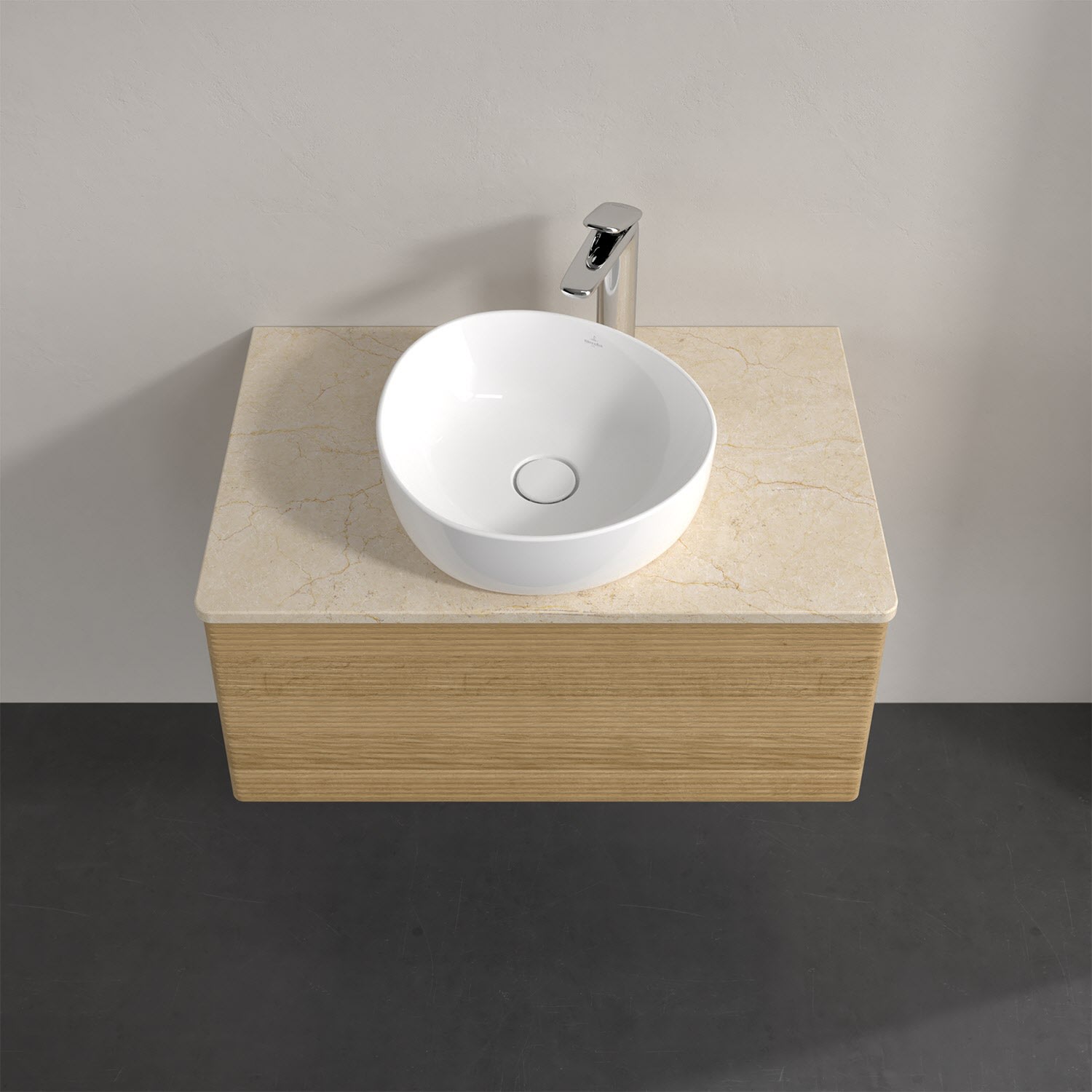 Für diesen Waschbeckenunterschrank stehen Ihnen Aufsatzwaschtische aus verschiedenen Serien zur Verfügung (siehe "Passliste" unter Downloads). Ein ausgewähltes Beispiel finden Sie im Zubehör. Den Waschtisch bitte separat mitbestellen.