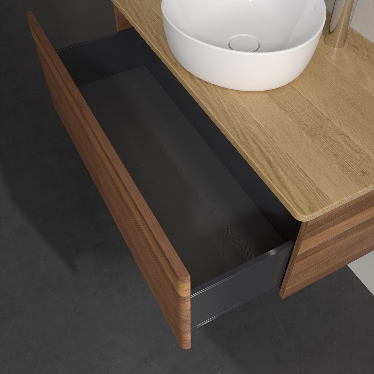 - kein Umfallen oder Verrutschen von Pflegeprodukten in den Schubladen dank rutschhemmendem Boden