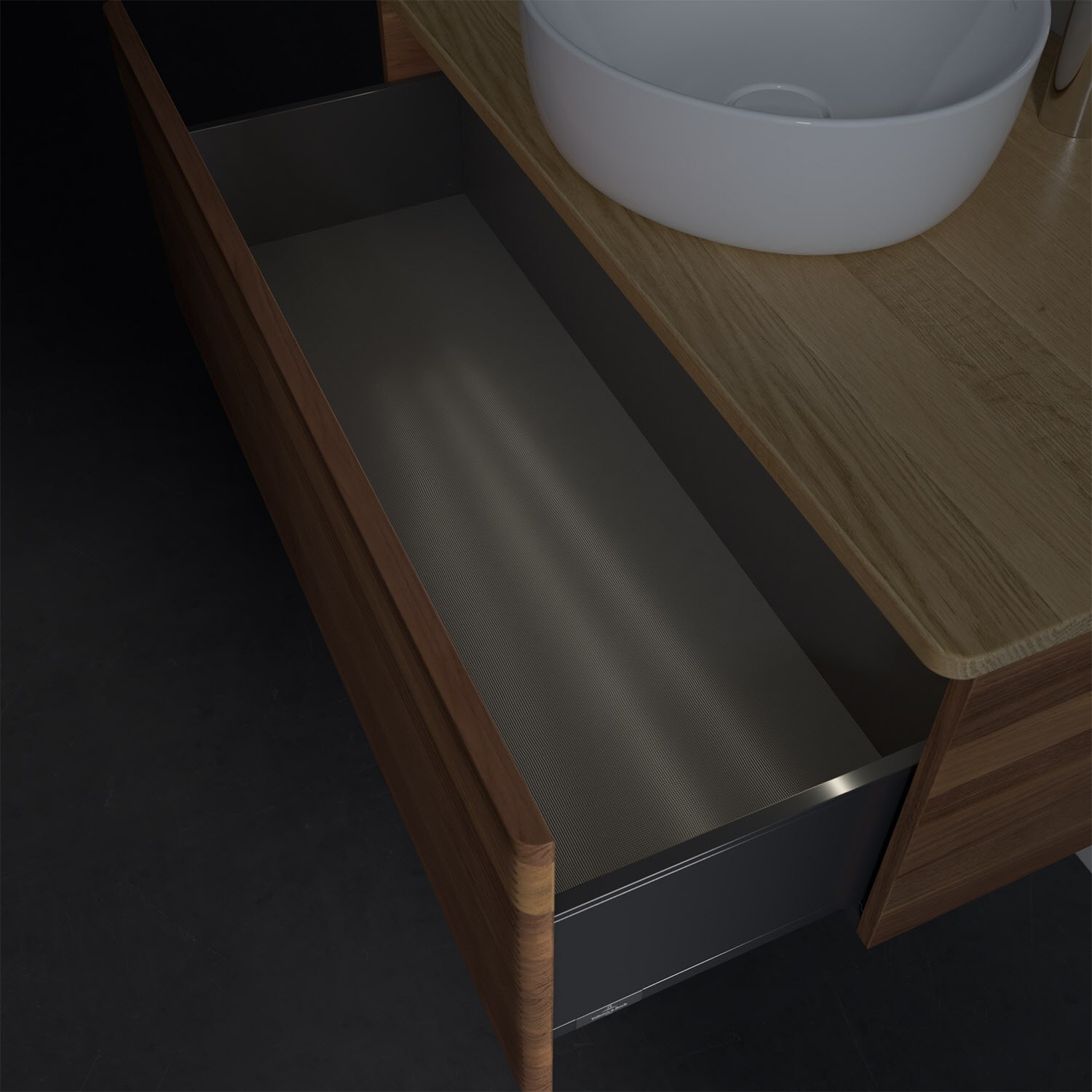 - in Schublade integrierte LED-Leiste mit warmweißem Licht zur Beleuchtung des Innenlebens