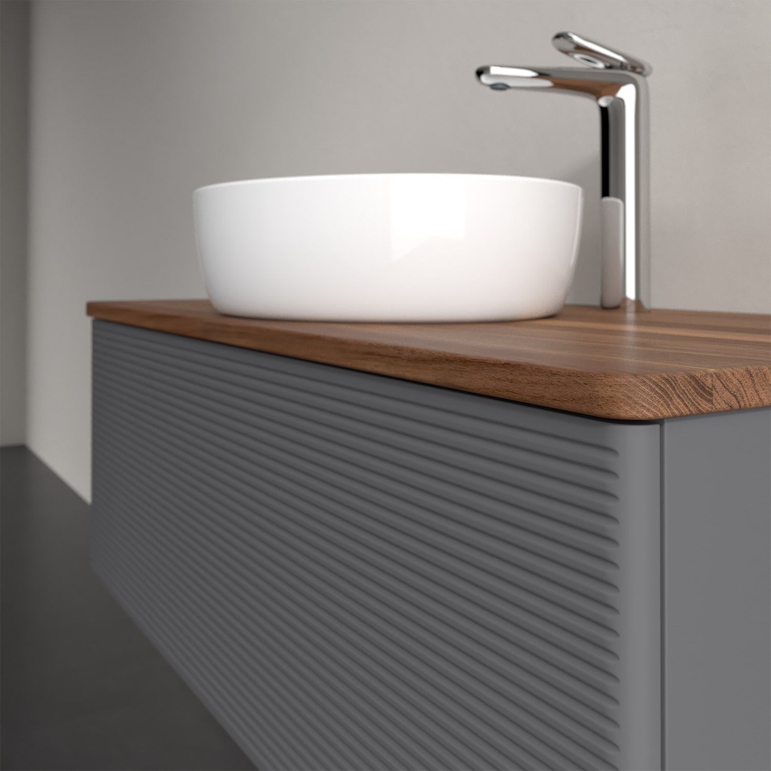 Mit dem wandhängenden Antao Waschtischunterschrank entscheidet man sich für eine hochwertige und praktische Stauraumlösung, die viel Freude bereitet. Die Funktionen sind besonders gut durchdacht: Im Inneren der beiden extra hohen und vollausziehbaren Auszüge können Handtücher, Kosmetik oder andere Pflegeprodukte dank des Antirutschbodens bequem aufbewahrt werden. Geöffnet wird das Möbel durch leichten Druck auf die strukturierte Front. Der Clou: Dabei schaltet sich die warmweiße Auszugsbeleuchtung ein. Natürlich verfügen die Auszüge über eingebaute Dämpfer, die sie anschließend wieder sanft und leise schließen lassen. Auch auf der Waschtischplatte finden die wichtigsten Utensilien seitlich des Waschtischs genügend Platz. Optisch sorgt der Unterschrank von Villeroy & Boch mit seinen abgerundeten Kanten für ein modernes, gemütliches Ambiente. Für eine besonders leichte Pflege sorgt die mehrschichtig deckend lackierte Oberfläche. Bei der Ausführung in Massivholz wird dank des verarbeiteten Massivholzes jedes Möbel zu einem Unikat, das sich durch das lebendige Naturmaterial durch seine einzigartige Struktur und Maserung auszeichnet.