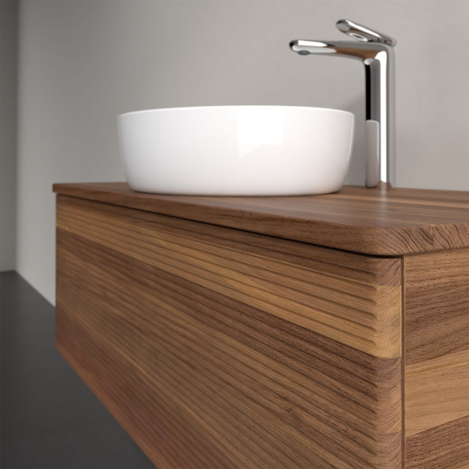 Für diesen Waschbeckenunterschrank stehen Ihnen Aufsatzwaschtische aus verschiedenen Serien zur Verfügung (siehe "Passliste" unter Downloads). Ein ausgewähltes Beispiel finden Sie im Zubehör. Den Waschtisch bitte separat mitbestellen.