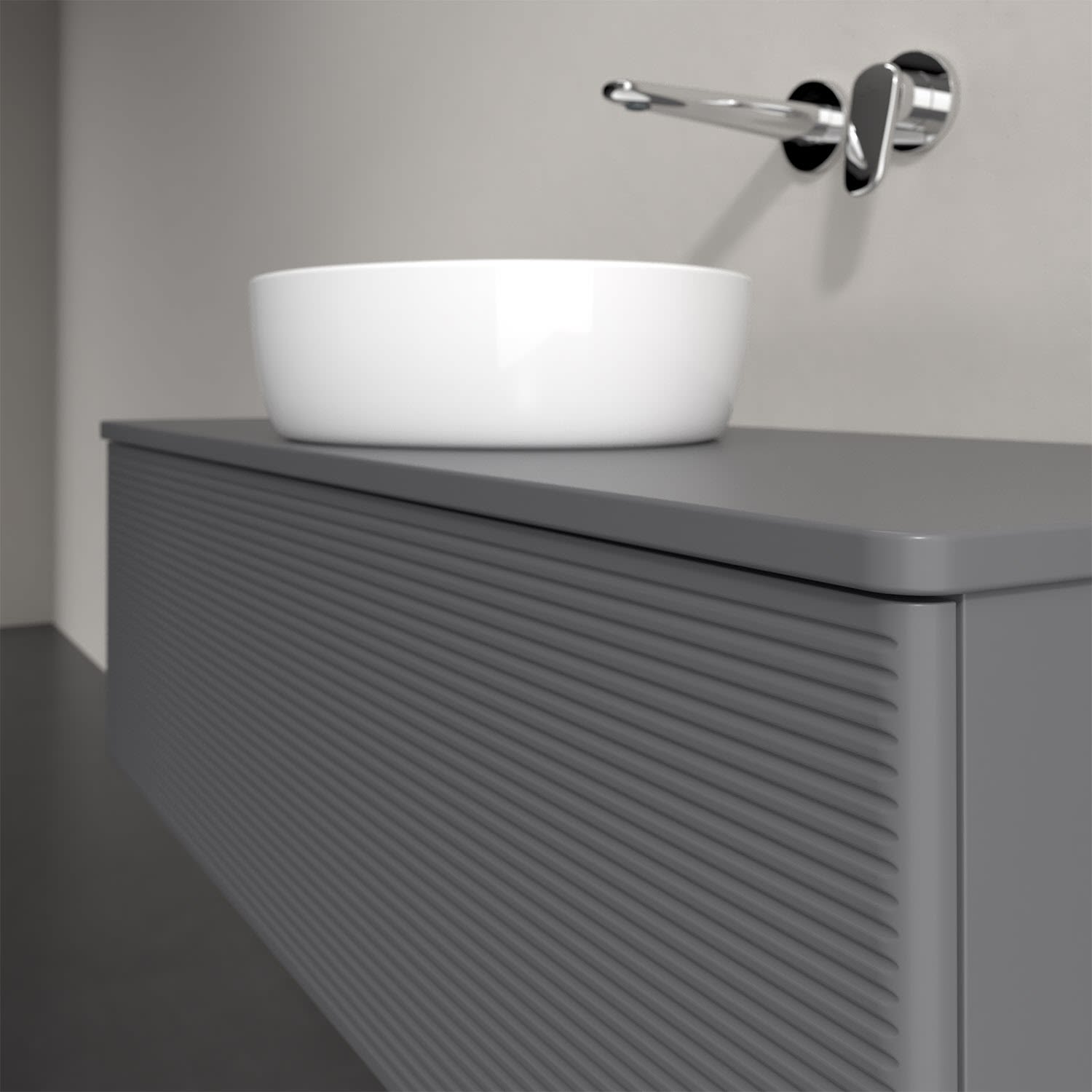 Der wandhängende Antao Waschtischunterschrank von Villeroy & Boch bietet nicht nur jede Menge Stauraum – er ist dank seines naturinspirierten Designs mit seinen abgerundeten Kanten auch noch besonders stilvoll und schafft eine gemütliche Atmosphäre im Badezimmer. Auf der Waschtischplatte bietet sich rechts und links neben dem Waschtisch viel Platz für Zahnbürstenbecher oder Seifenspender. Ein extra hoher Auszug bietet viel Platz, um alles Notwendige zu verstauen und Ordnung zu halten. Öffnen lässt er sich durch leichten Druck auf die strukturierte Front. Dabei aktiviert sich übrigens die Auszugsbeleuchtung in angenehmem Warmweiß. Dank Vollauszug hat man immer alles im Blick und der Antirutschboden verhindert ein Umfallen oder Verrutschen der Gegenstände. Einfach clever! Für eine besonders leichte Pflege sorgt die mehrschichtig deckend lackierte Oberfläche.