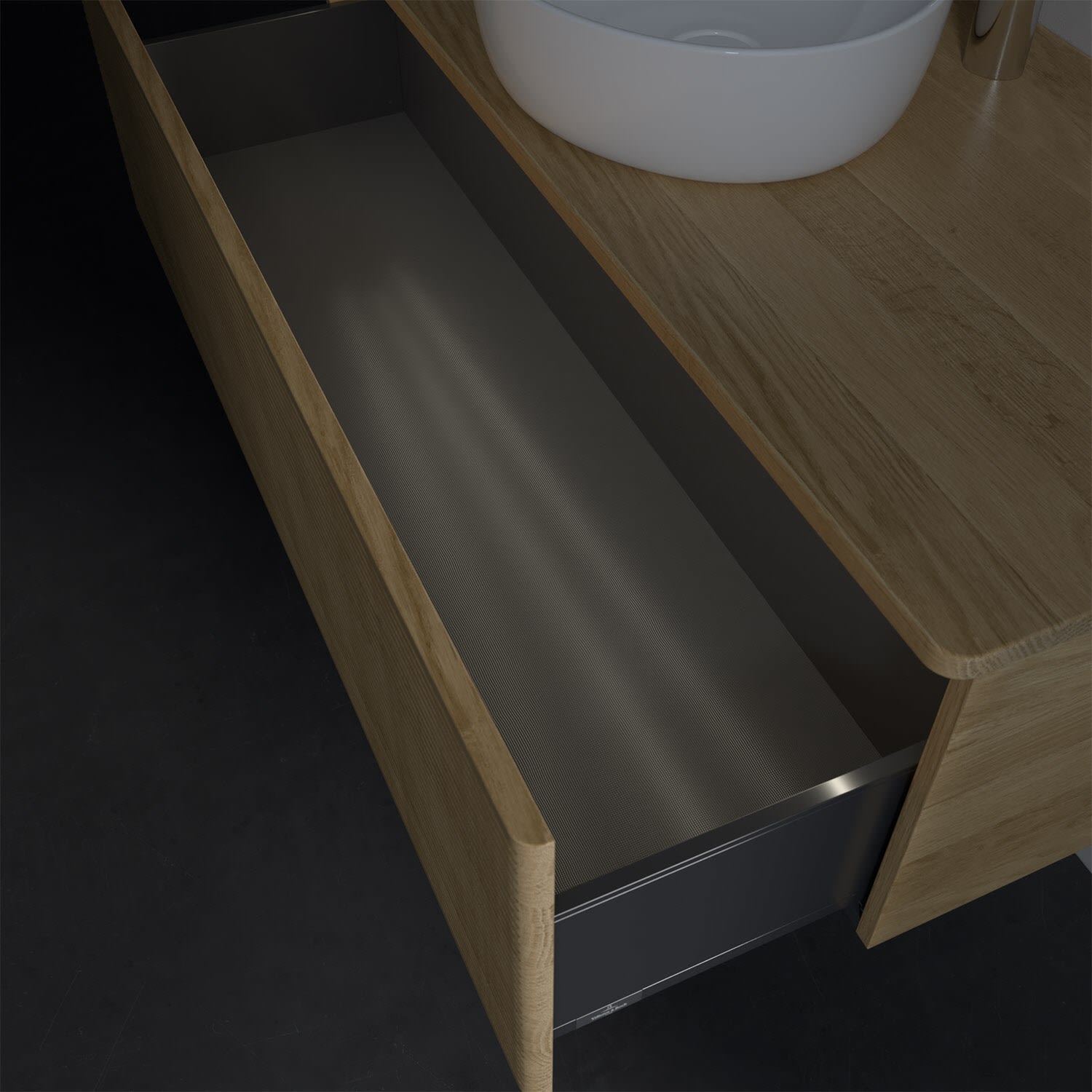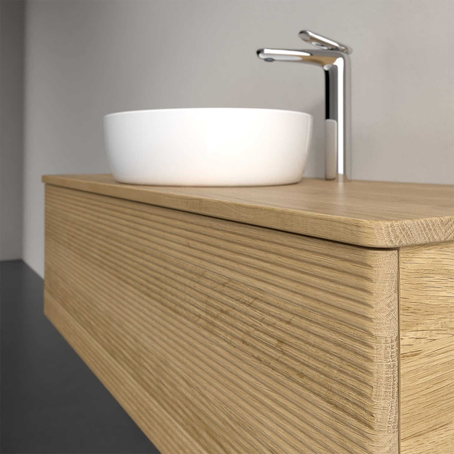 Der wandhängende Antao Waschtischunterschrank von Villeroy & Boch bietet nicht nur jede Menge Stauraum – er ist dank seines naturinspirierten Designs mit seinen abgerundeten Kanten auch noch besonders stilvoll und schafft eine gemütliche Atmosphäre im Badezimmer. Auf der Waschtischplatte bietet sich rechts und links neben dem Waschtisch viel Platz für Zahnbürstenbecher oder Seifenspender. Ein extra hoher Auszug bietet viel Platz, um alles Notwendige zu verstauen und Ordnung zu halten. Öffnen lässt er sich durch leichten Druck auf die strukturierte Front. Dabei aktiviert sich übrigens die Auszugsbeleuchtung in angenehmem Warmweiß. Dank Vollauszug hat man immer alles im Blick und der Antirutschboden verhindert ein Umfallen oder Verrutschen der Gegenstände. Einfach clever! Für eine besonders leichte Pflege sorgt die mehrschichtig deckend lackierte Oberfläche. Bei der Ausführung in Massivholz wird dank des verarbeiteten Massivholzes jedes Möbel zu einem Unikat, das sich durch das lebendige Naturmaterial durch seine einzigartige Struktur und Maserung auszeichnet.