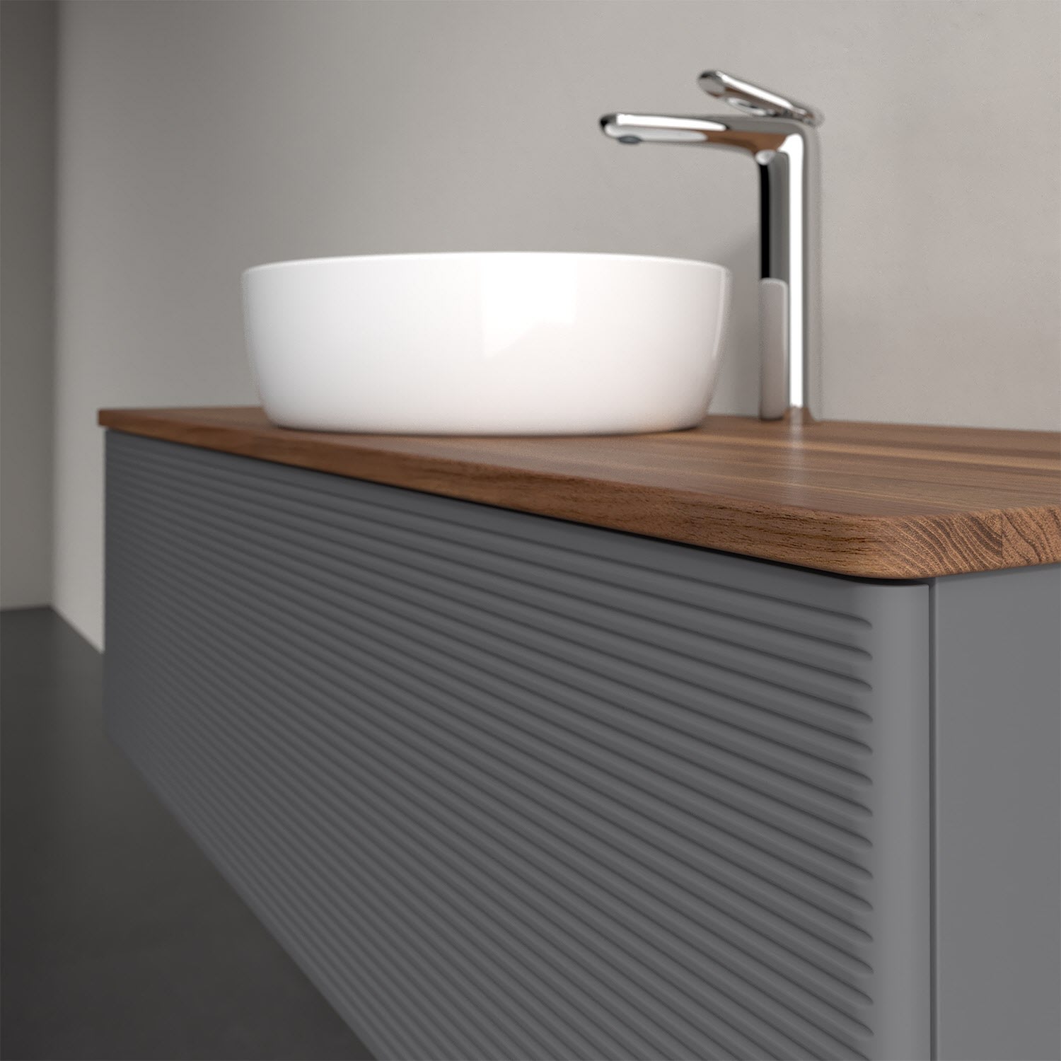Der wandhängende Antao Waschtischunterschrank von Villeroy & Boch bietet nicht nur jede Menge Stauraum – er ist dank seines naturinspirierten Designs mit seinen abgerundeten Kanten auch noch besonders stilvoll und schafft eine gemütliche Atmosphäre im Badezimmer. Auf der Waschtischplatte bietet sich rechts und links neben dem Waschtisch viel Platz für Zahnbürstenbecher oder Seifenspender. Ein extra hoher Auszug bietet viel Platz, um alles Notwendige zu verstauen und Ordnung zu halten. Öffnen lässt er sich durch leichten Druck auf die strukturierte Front. Dabei aktiviert sich übrigens die Auszugsbeleuchtung in angenehmem Warmweiß. Dank Vollauszug hat man immer alles im Blick und der Antirutschboden verhindert ein Umfallen oder Verrutschen der Gegenstände. Einfach clever! Für eine besonders leichte Pflege sorgt die mehrschichtig deckend lackierte Oberfläche. Bei der Ausführung in Massivholz wird dank des verarbeiteten Massivholzes jedes Möbel zu einem Unikat, das sich durch das lebendige Naturmaterial durch seine einzigartige Struktur und Maserung auszeichnet.