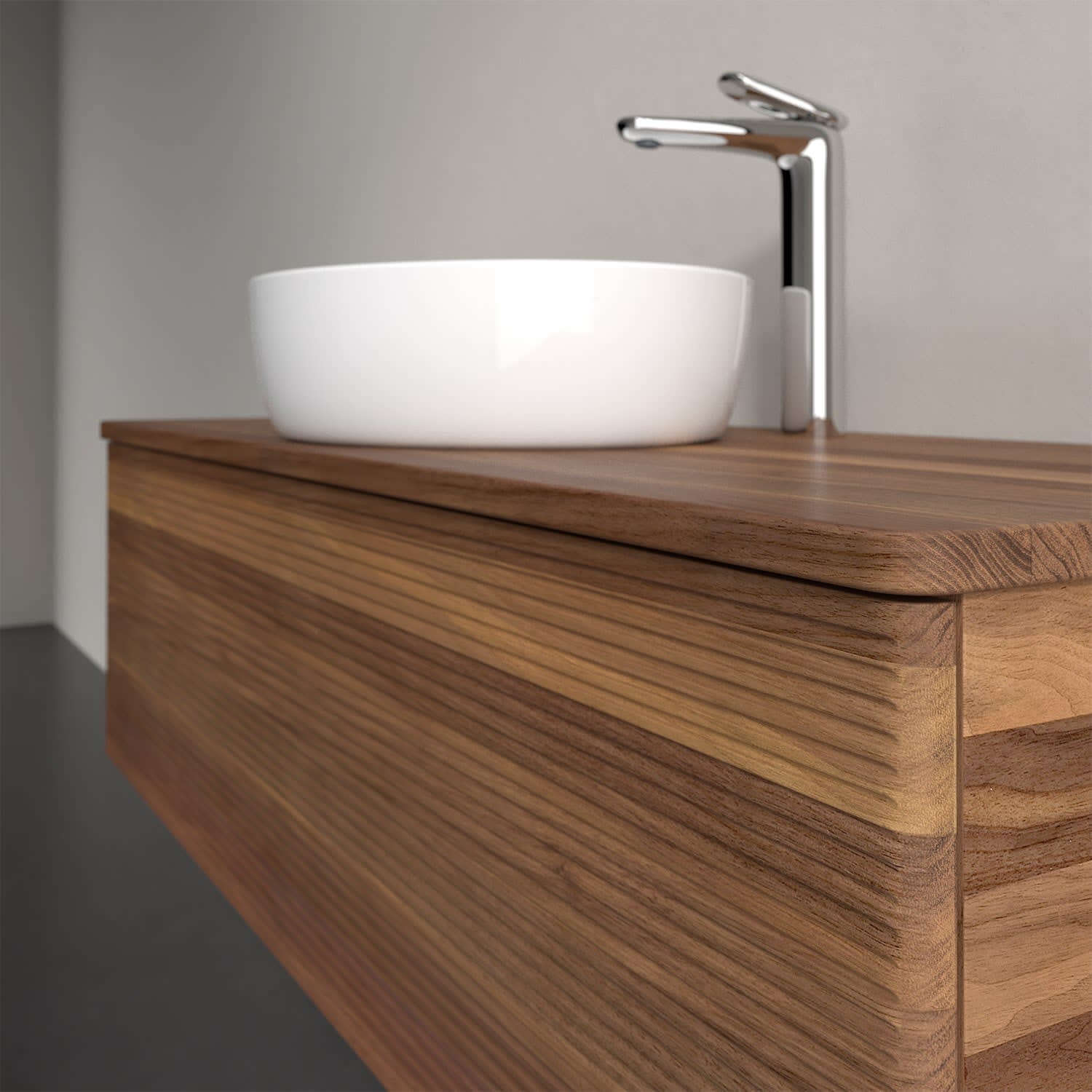 Der wandhängende Antao Waschtischunterschrank von Villeroy & Boch bietet nicht nur jede Menge Stauraum – er ist dank seines naturinspirierten Designs mit seinen abgerundeten Kanten auch noch besonders stilvoll und schafft eine gemütliche Atmosphäre im Badezimmer. Auf der Waschtischplatte bietet sich rechts und links neben dem Waschtisch viel Platz für Zahnbürstenbecher oder Seifenspender. Ein extra hoher Auszug bietet viel Platz, um alles Notwendige zu verstauen und Ordnung zu halten. Öffnen lässt er sich durch leichten Druck auf die strukturierte Front. Dabei aktiviert sich übrigens die Auszugsbeleuchtung in angenehmem Warmweiß. Dank Vollauszug hat man immer alles im Blick und der Antirutschboden verhindert ein Umfallen oder Verrutschen der Gegenstände. Einfach clever! Für eine besonders leichte Pflege sorgt die mehrschichtig deckend lackierte Oberfläche. Bei der Ausführung in Massivholz wird dank des verarbeiteten Massivholzes jedes Möbel zu einem Unikat, das sich durch das lebendige Naturmaterial durch seine einzigartige Struktur und Maserung auszeichnet.